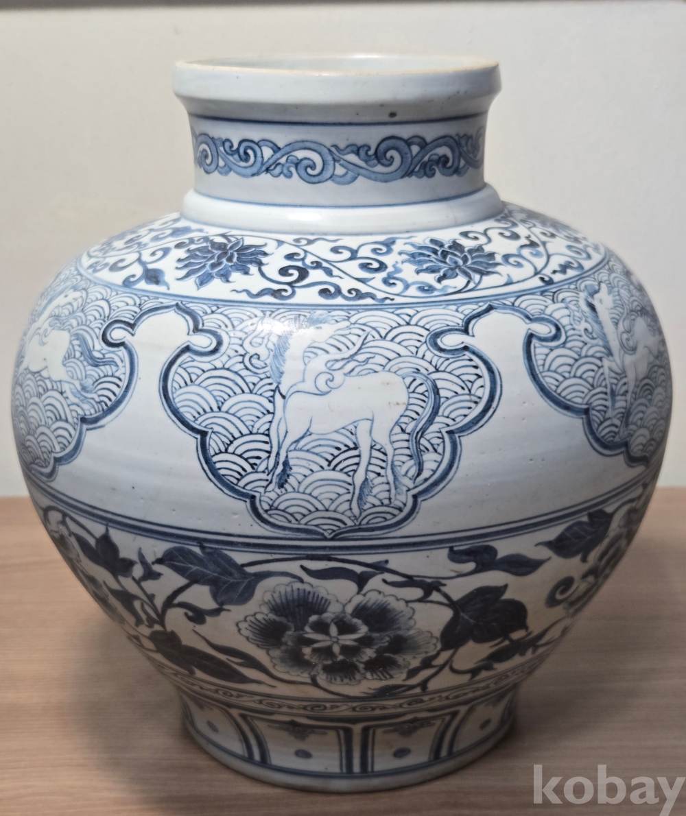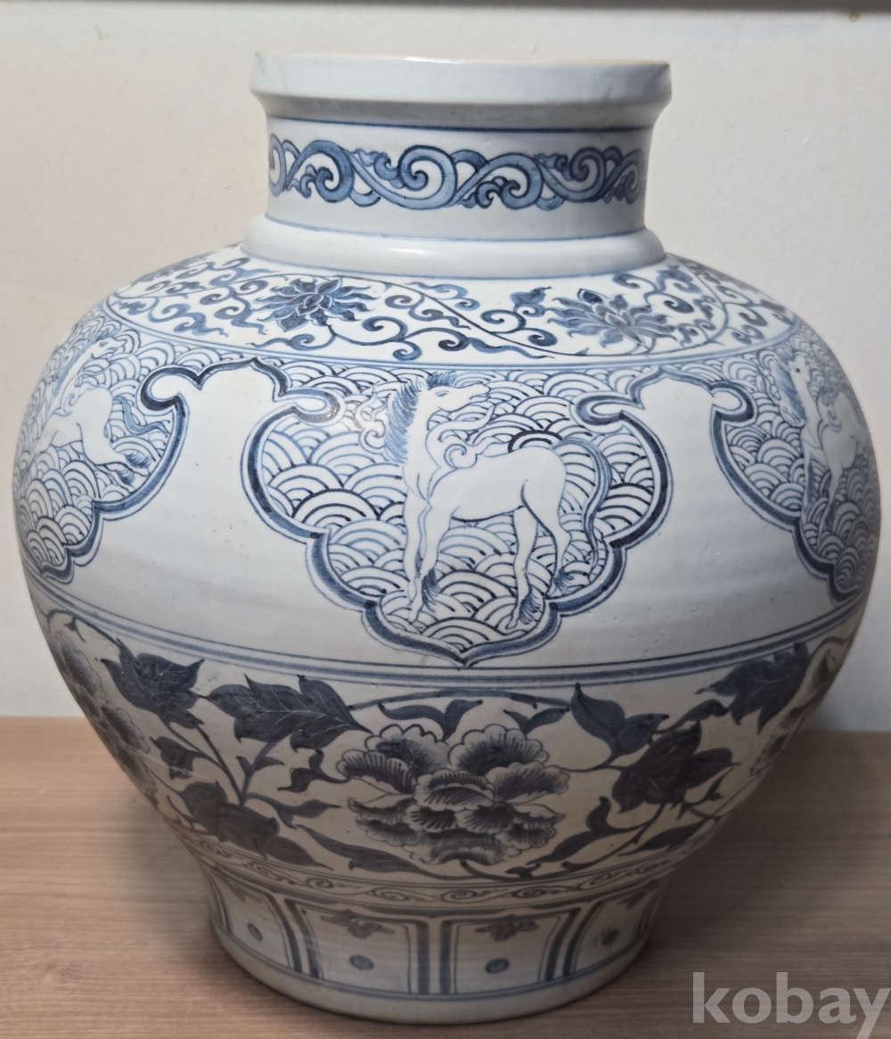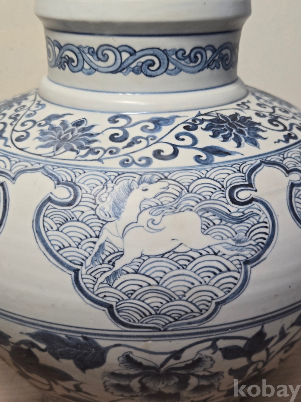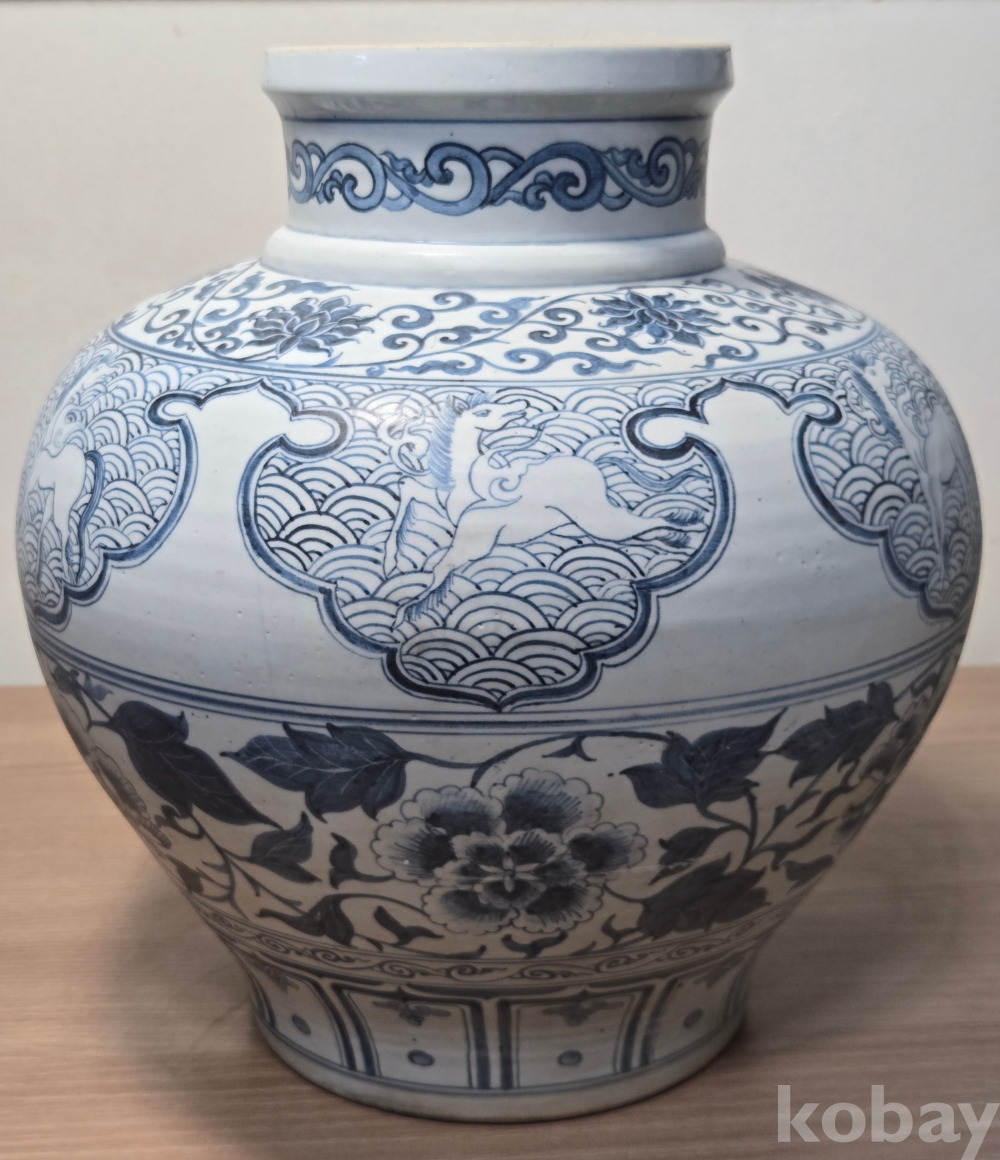 14세기 중국 원대 경덕진제작, 파도를 넘어 하늘로 차고 오르는 역동적인 천마의 모습과 모란당초도안으로 어우러진 청화백자 항아리 즉 원청화천마문 대관 元靑花天馬文大罐 입니다.