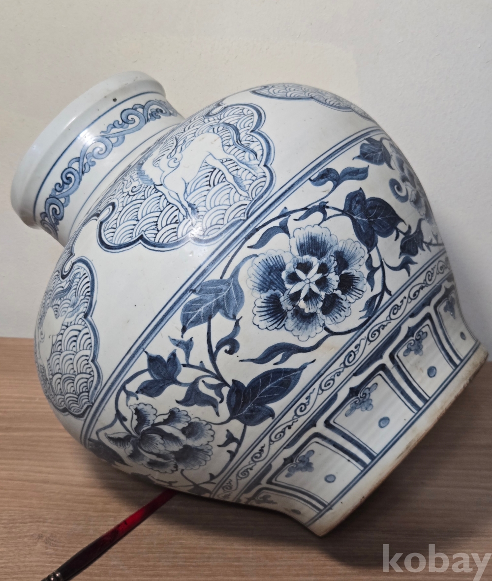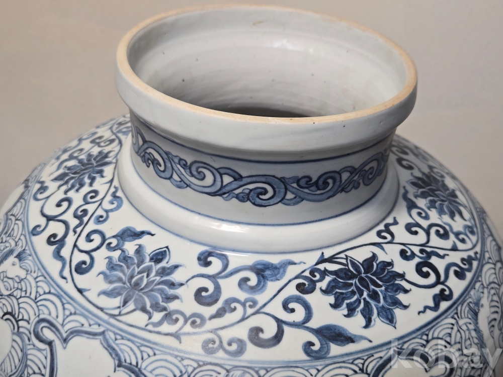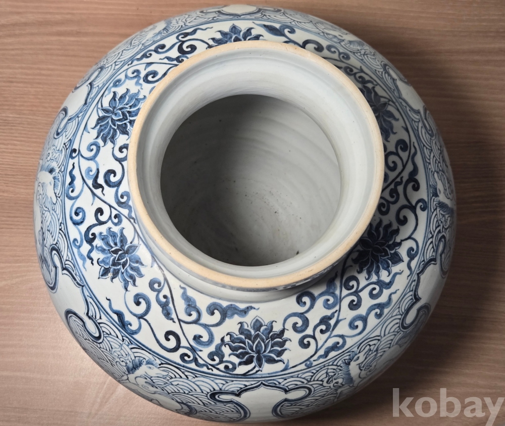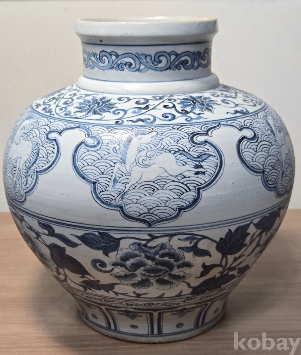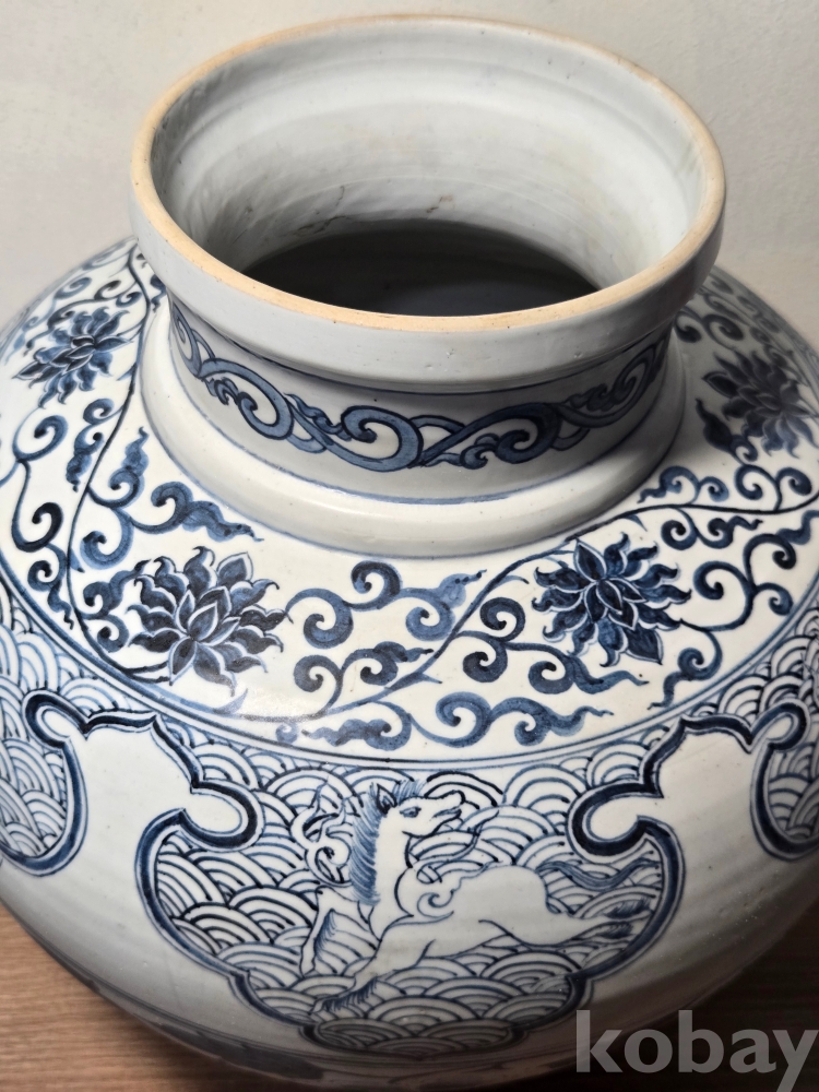 14세기 중국 원대 경덕진제작, 파도를 넘어 하늘로 차고 오르는 역동적인 천마의 모습과 모란당초도안으로 어우러진 청화백자 항아리 즉 원청화천마문 대관 元靑花天馬文大罐 입니다.