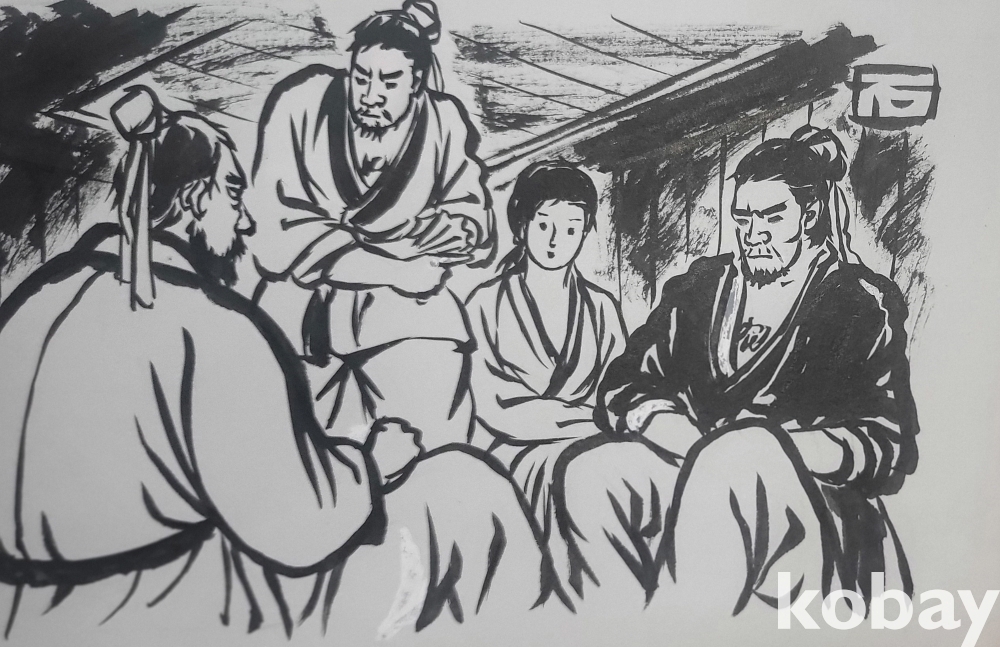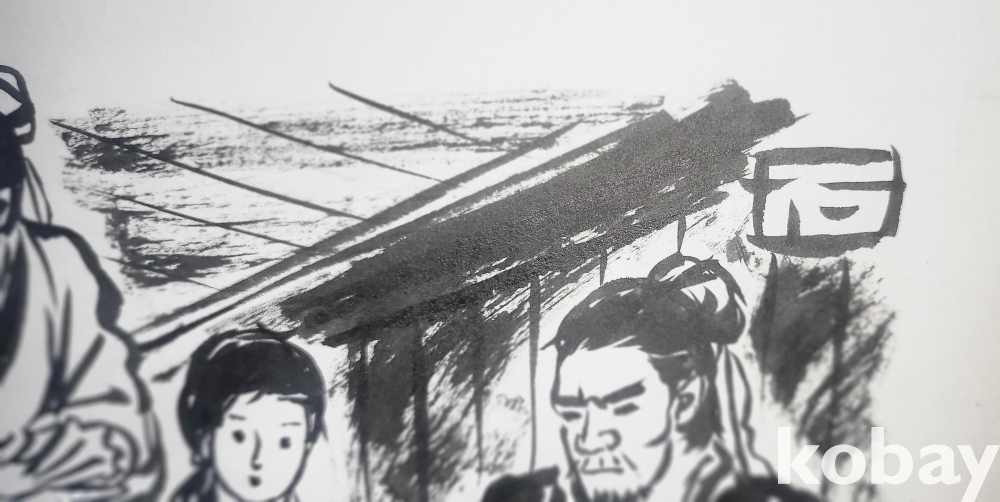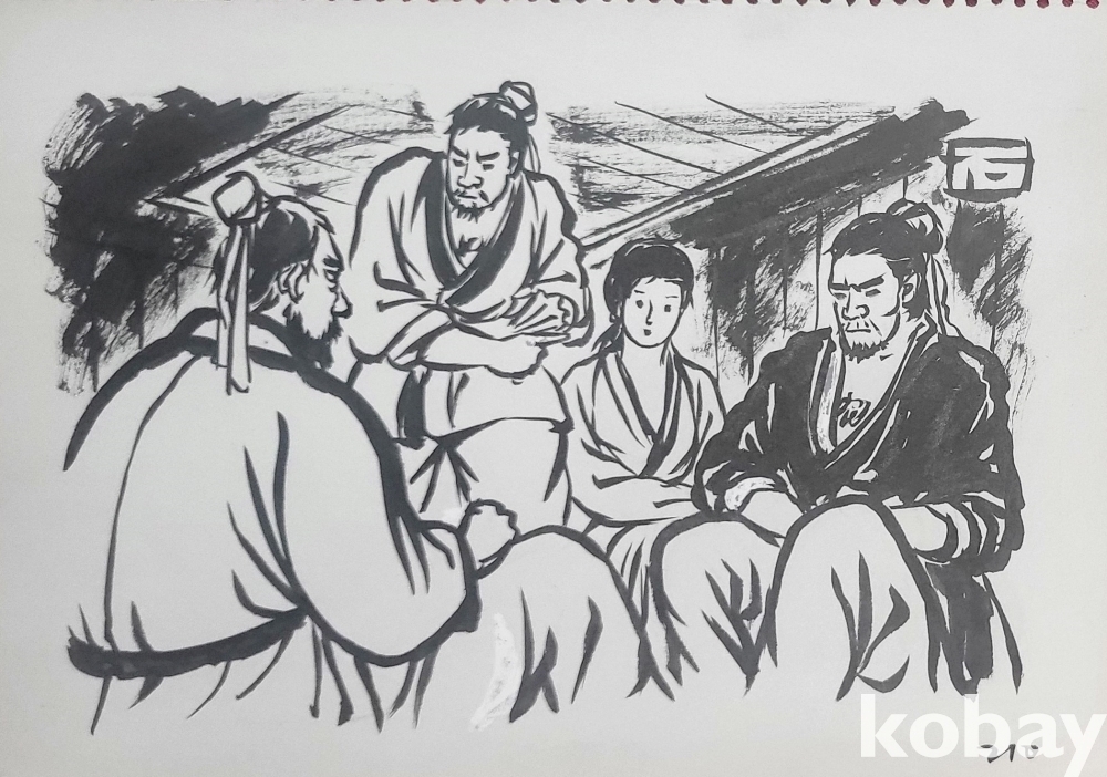 물과 먹으로 만 직접 그려진 수묵화 삽화입니다,