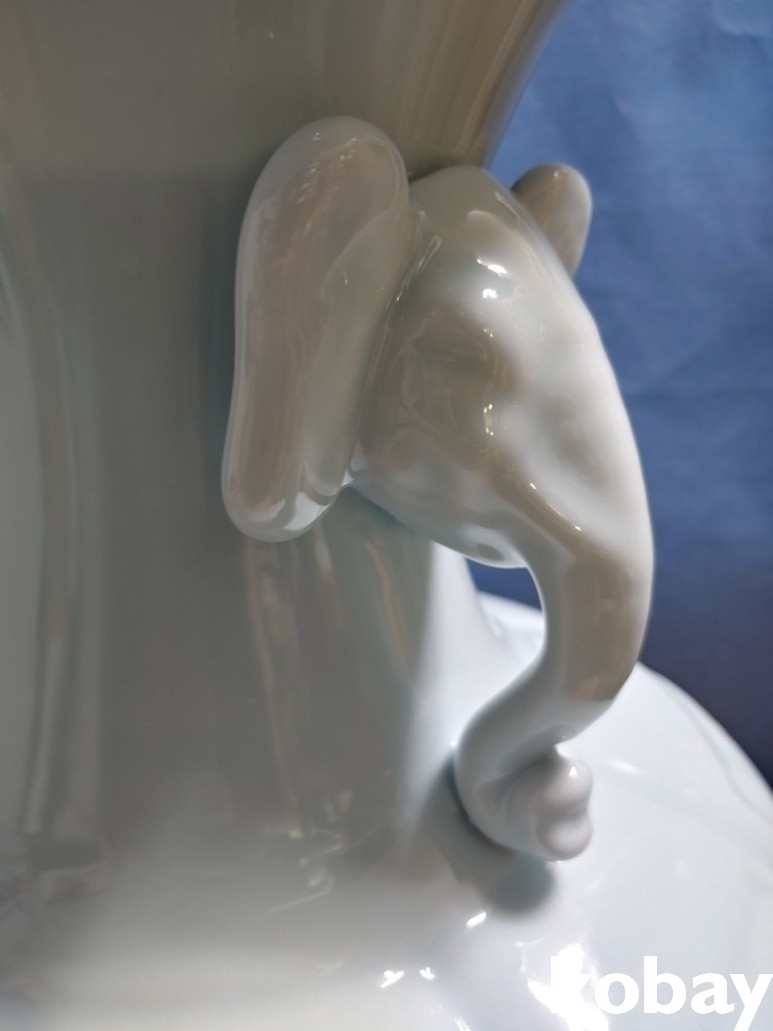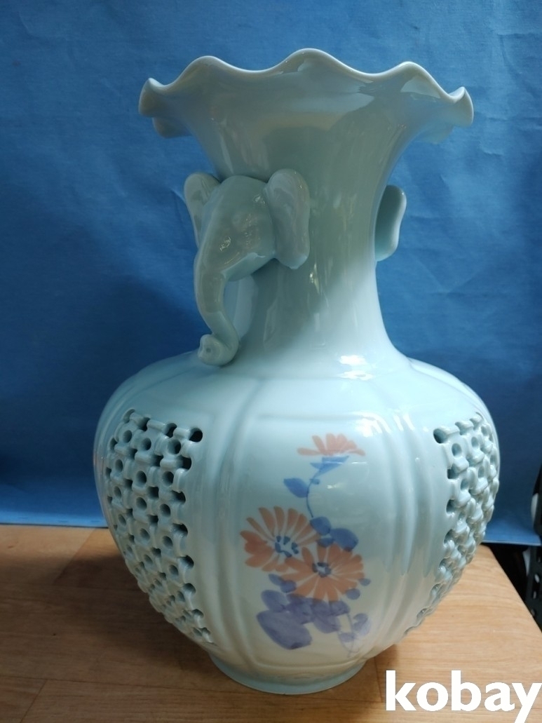 코끼리 머리 양 손잡이에 주름형 도자기 입니다.
