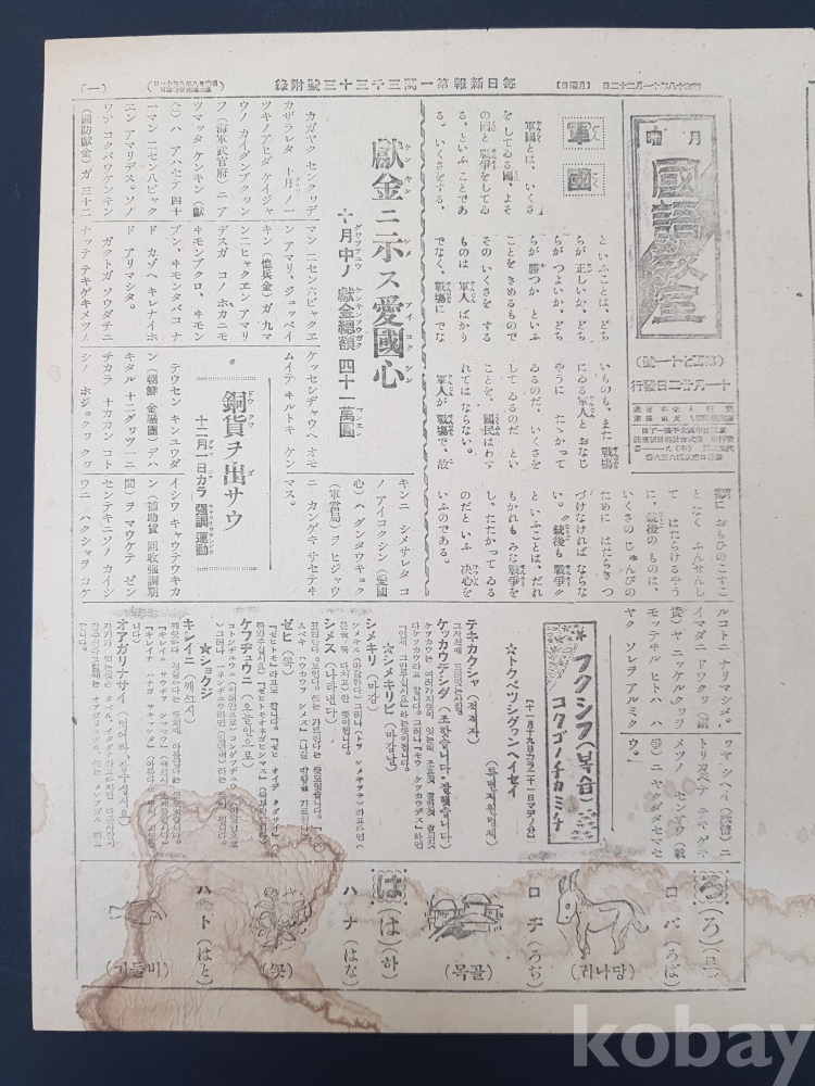 **** 京城 매일신문사 발행 [月曜 國語敎室] 제171호/1면에 國防獻金을 독려하는 내용이 실림/총 4면,일어 표기
