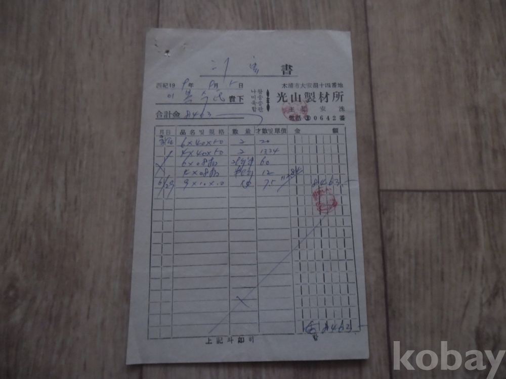 1969년 목포 광산제재소 발행 계산서