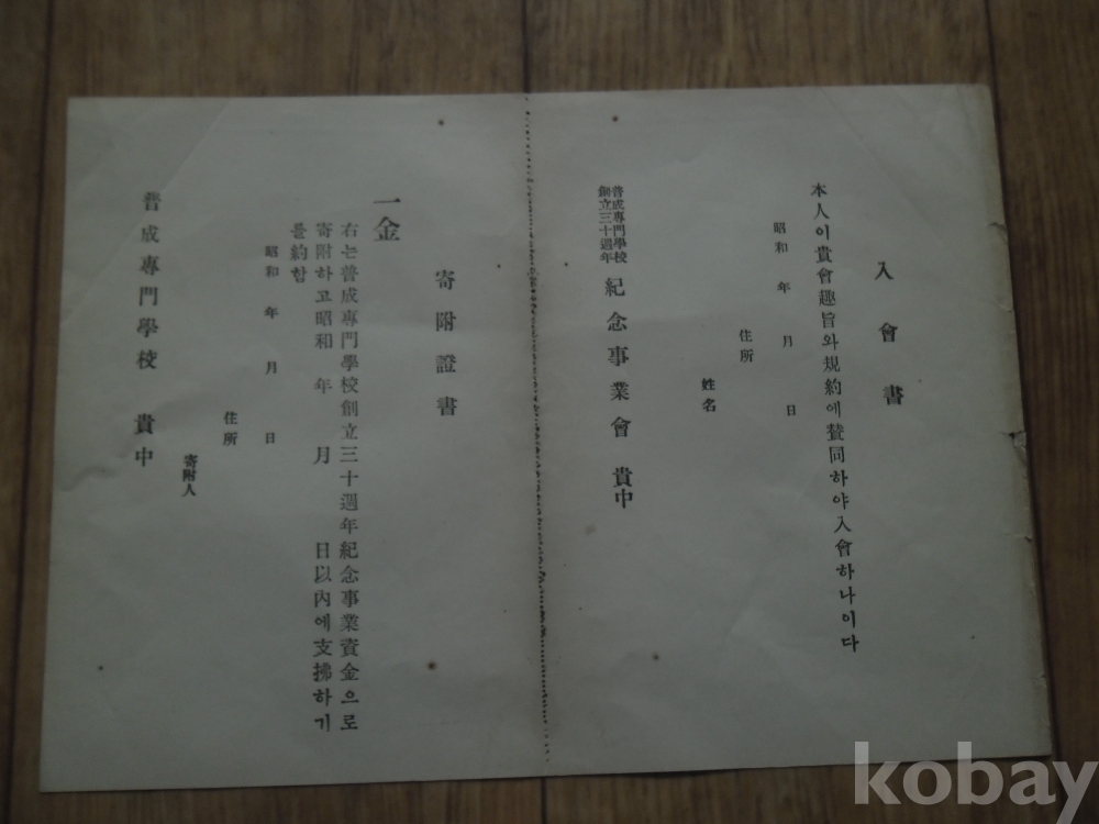 보성전문학교 창립30주년 기념사업회 입회서/기부증서(미사용)