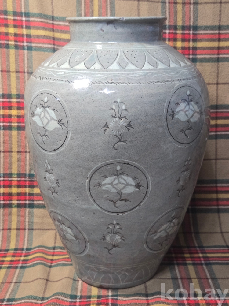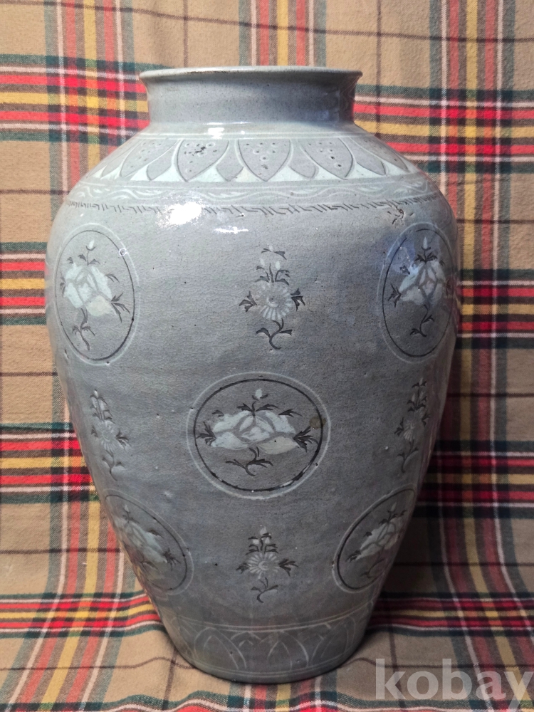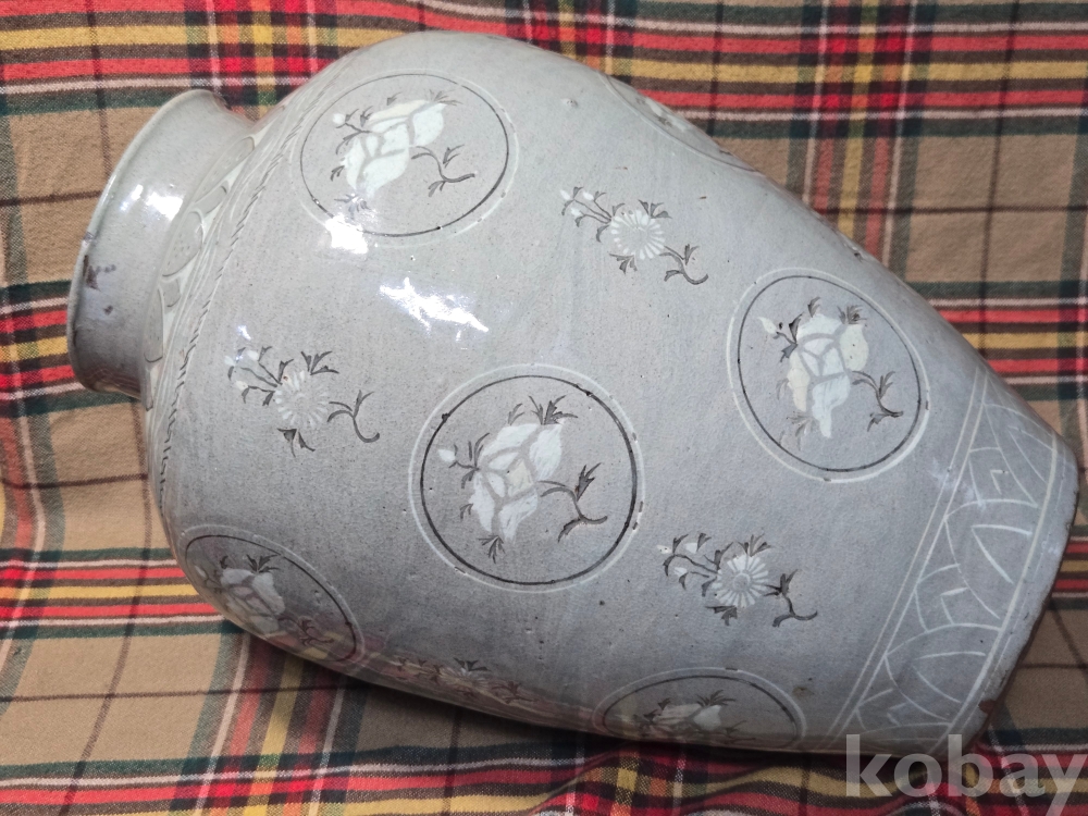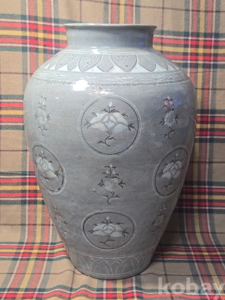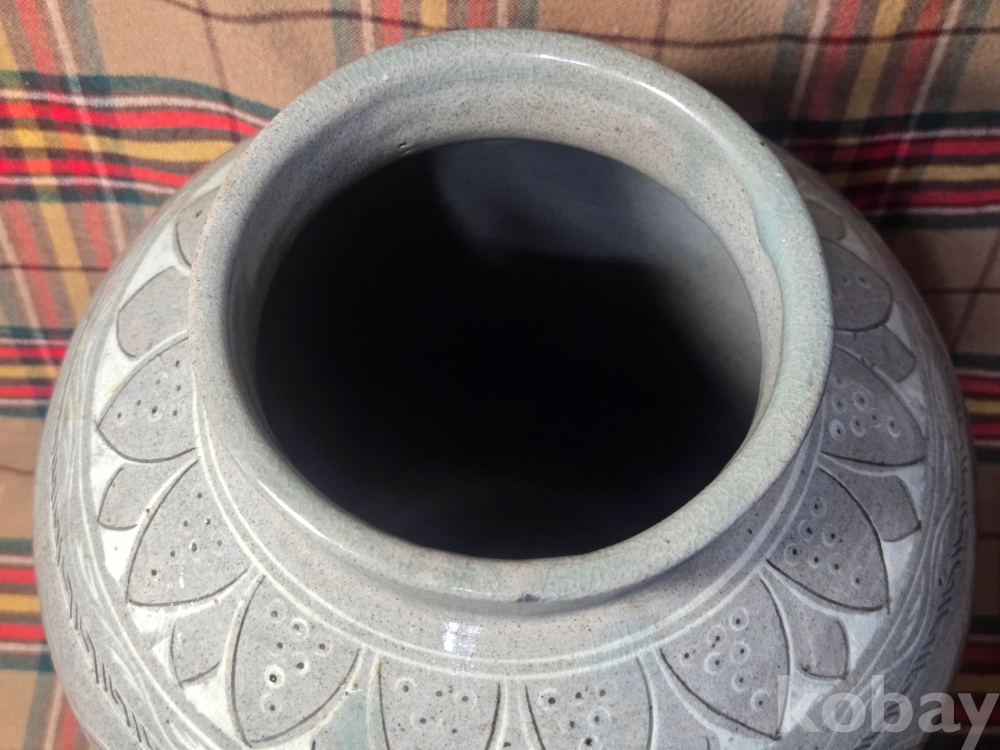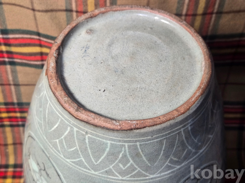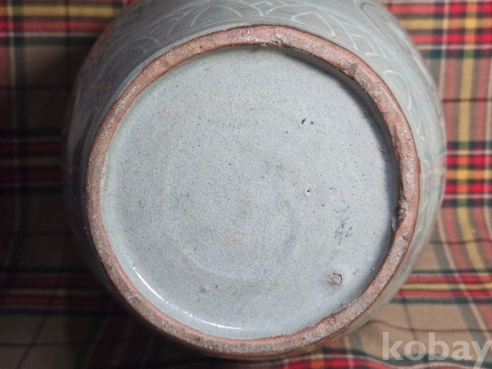 수암.. 이라는 수결이 있는 오래된 청자 흑백상감 대형항아리입니다. 굽의 성형형태, 전반적인 발색등 작품의 기법으로 볼때 대략 한국현대도예 1세대급의 오래된 작품으로 추정..