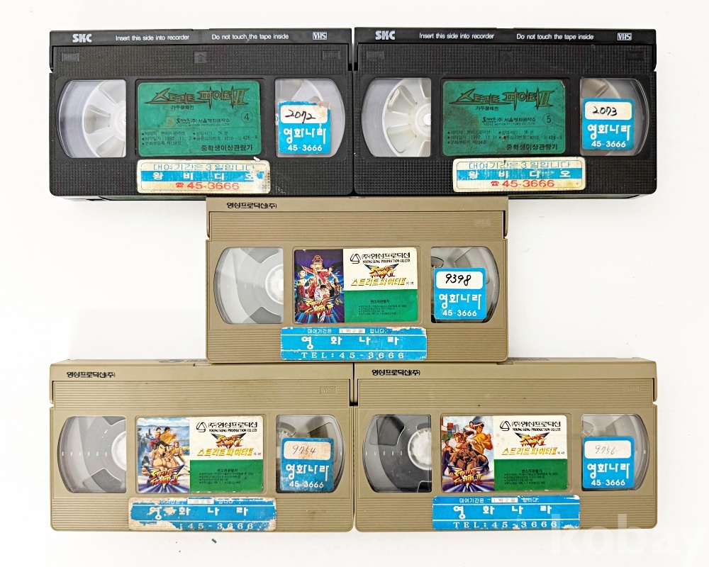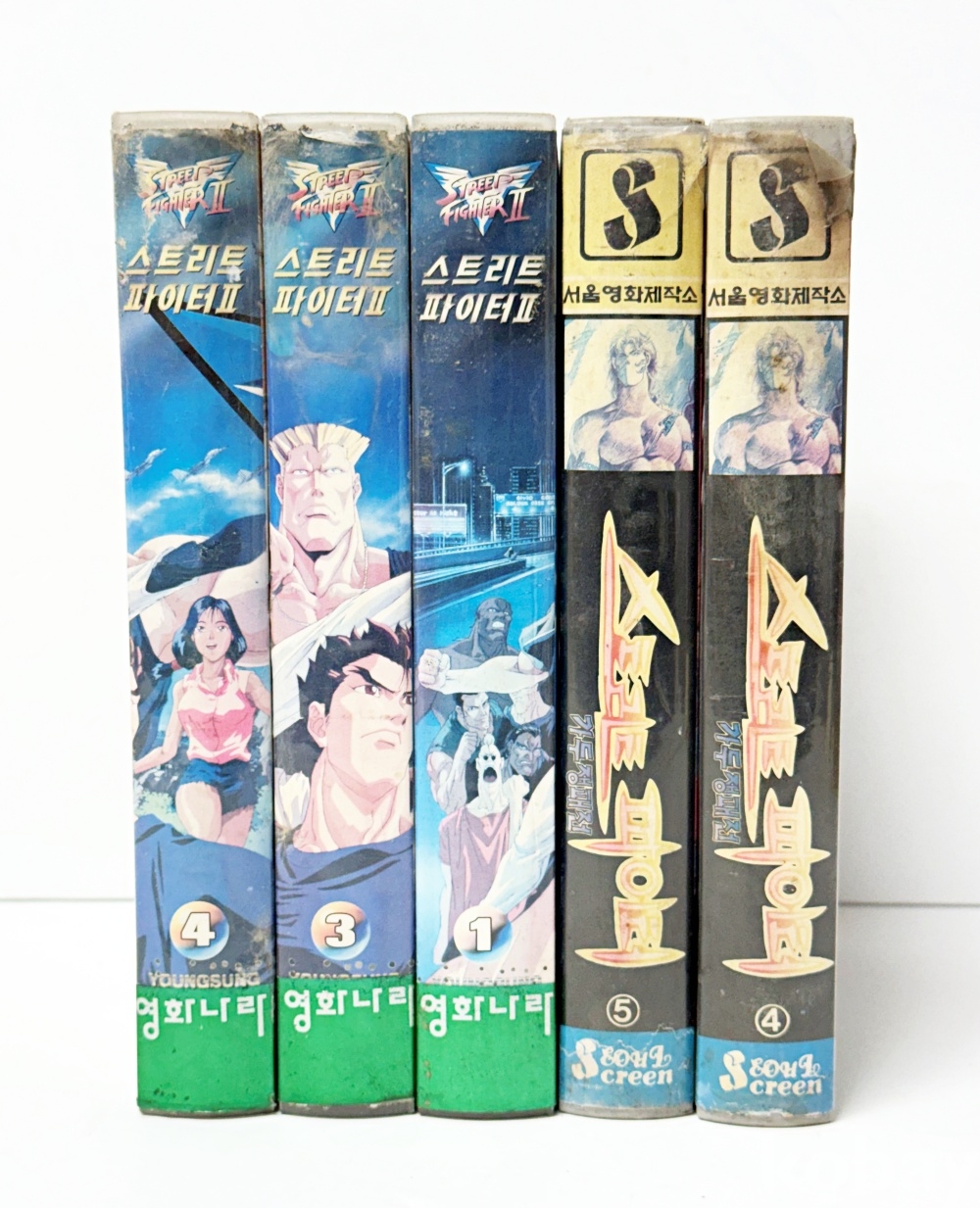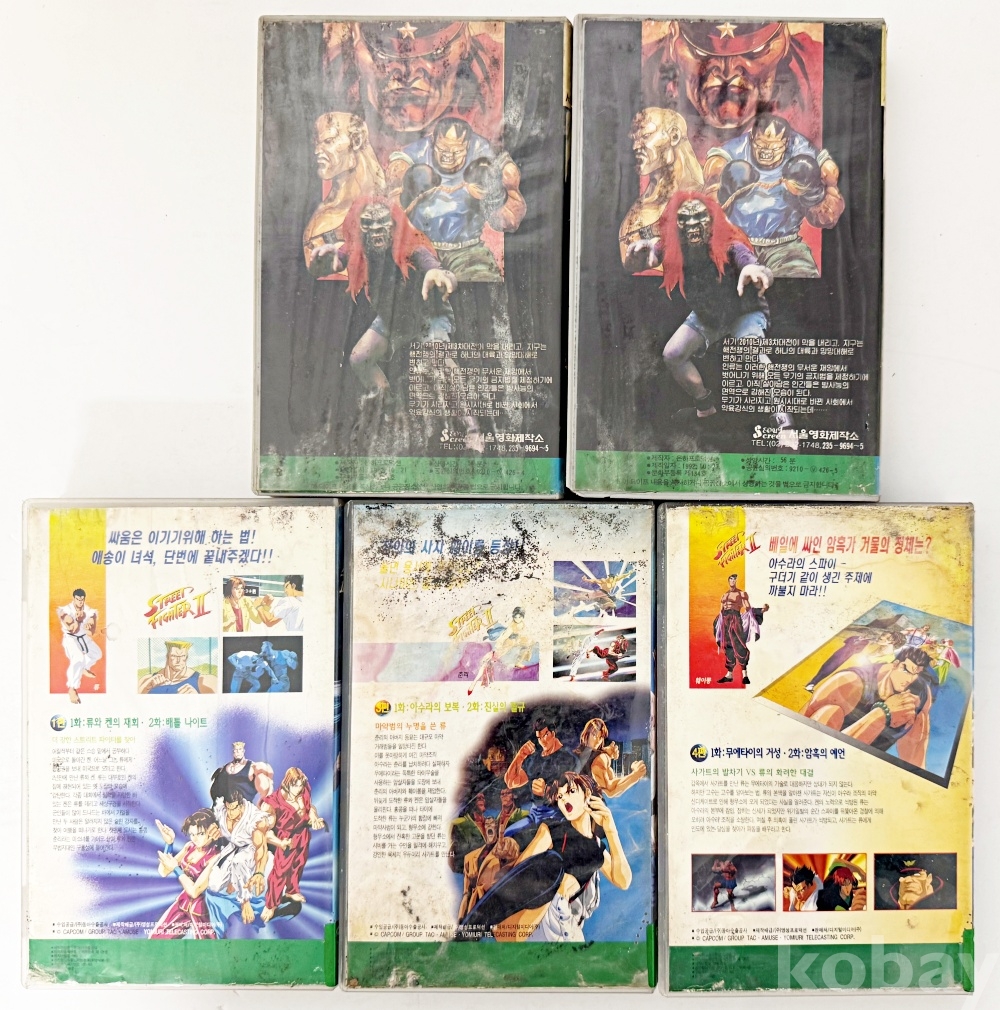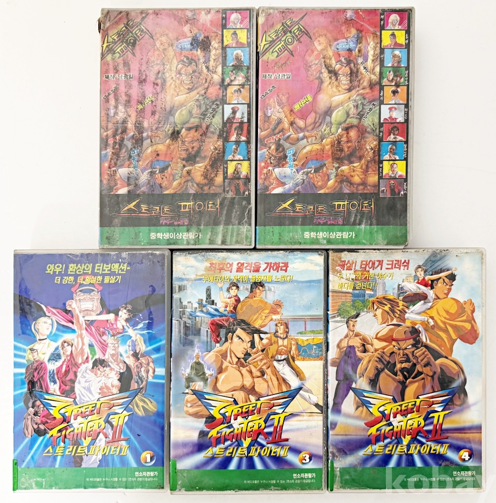 상품 설명 | 1) 스트리트 파이터 가두쟁패전 4편 / 1992년 2) 스트리트 파이터 가두쟁패전 5편 / 1992년 / 케이스 모서리 깨짐, 테이프 곰팡이 3) 스트리트 파이터 Ⅱ 1편 / 1997년 4) 스트리트 파이터 Ⅱ 3편 / 1997년 5) 스트리트 파이터 Ⅱ 4편 / 1997년 / 테이프 라벨 찢어짐 |