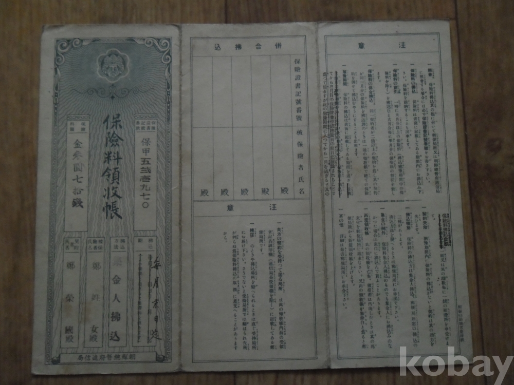 소화12년 조선총독부체신국 발행 보험료영수장