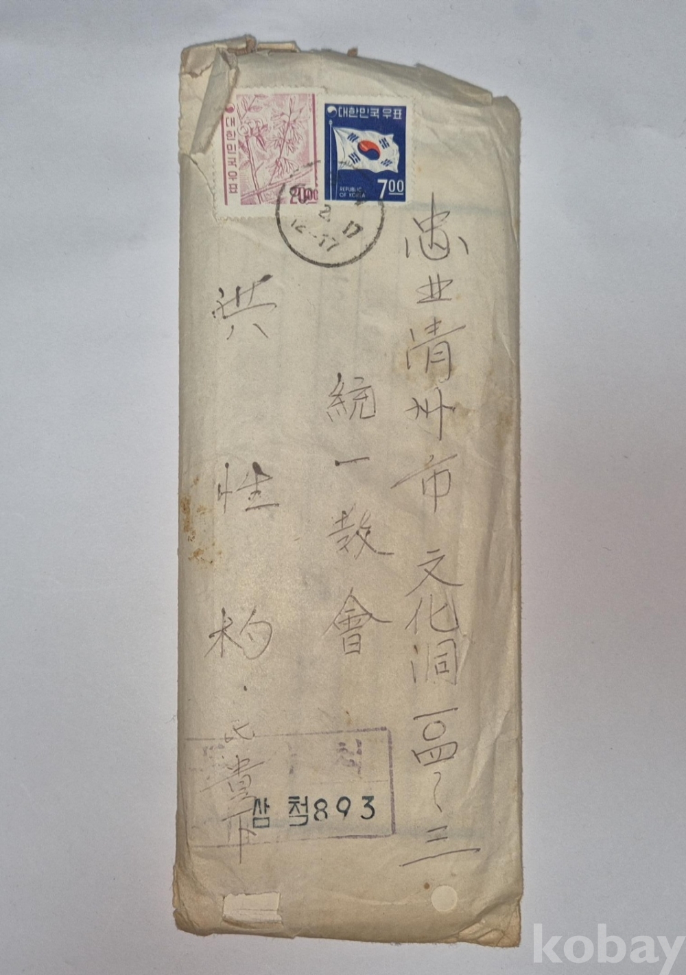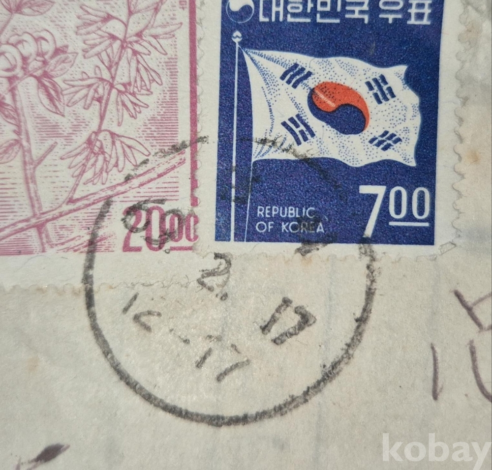 1968년 발행된 '태극기 보통우표 7원' 1매가 첩부된 실체입니다.