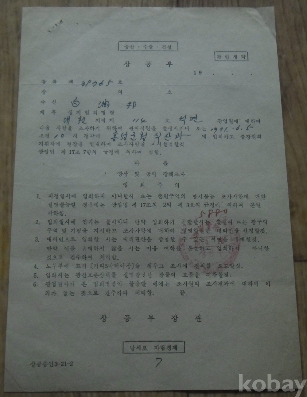 1971년 광업권의 실지입회명령(상공부)
