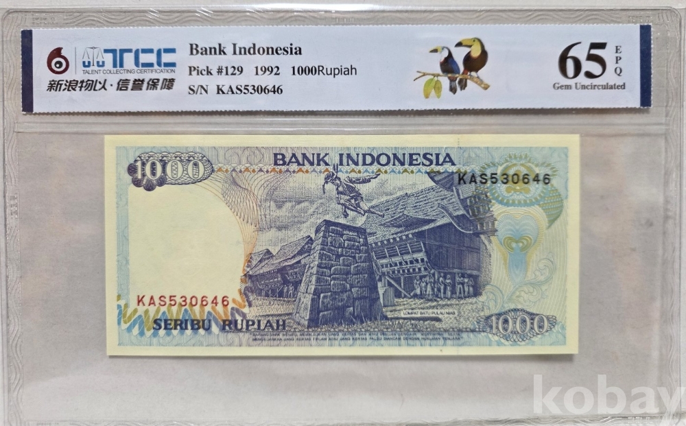-1992년 인도네시아 1000루피아 지폐 TCC65 등급 입니다.
