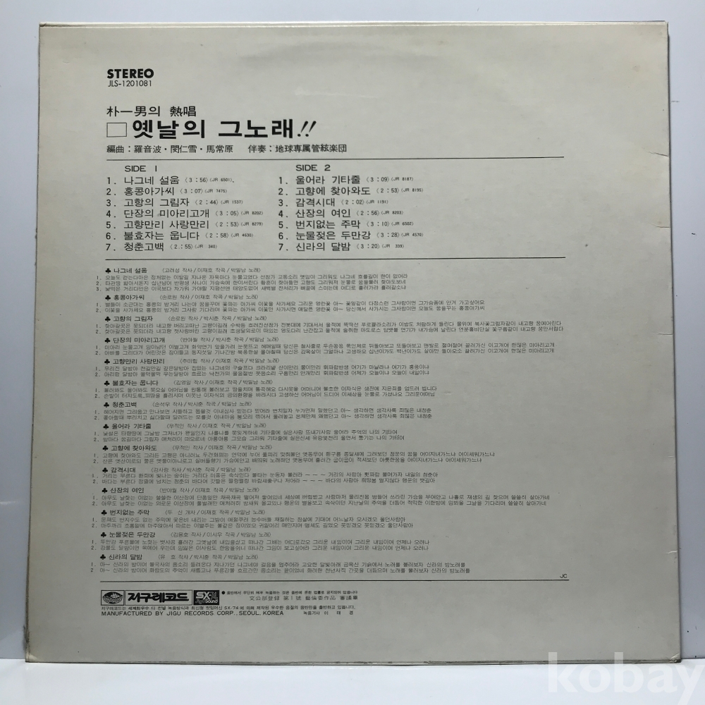 | 자켓상태 | EX : 약간의 마모, 모서리 찢김 존재 | 음반상태 | EX : 재생에 영향 없는 가벼운 기스 존재 | 발매정보 | 알수없음 | 가사지여부 | 무 |