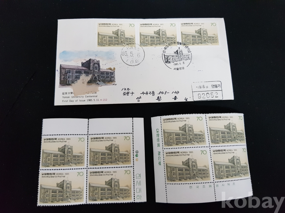 - 1985년 연세대학교 창립 100주년 기념 안내카드, 초일봉피, 명판 등 모음