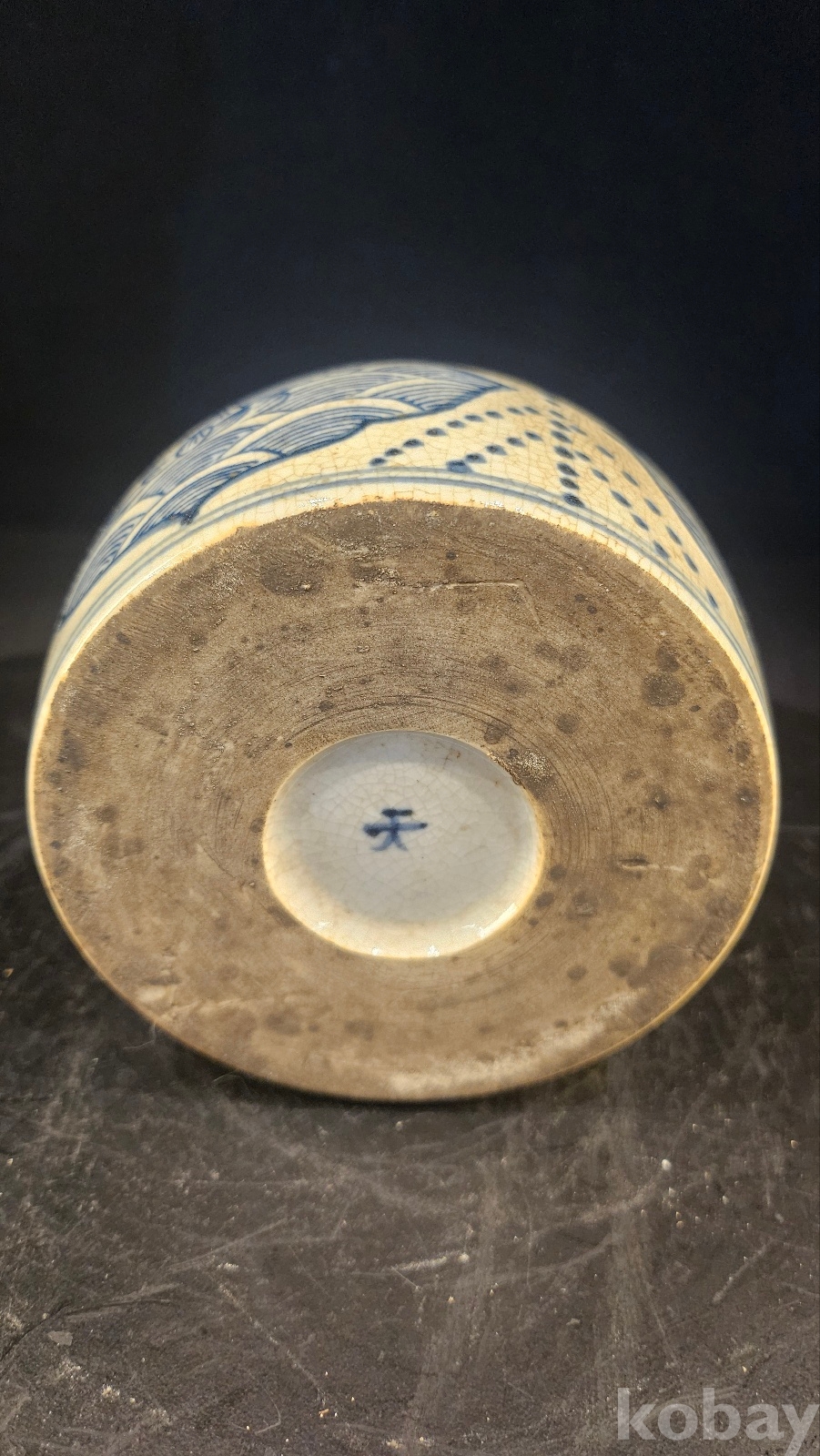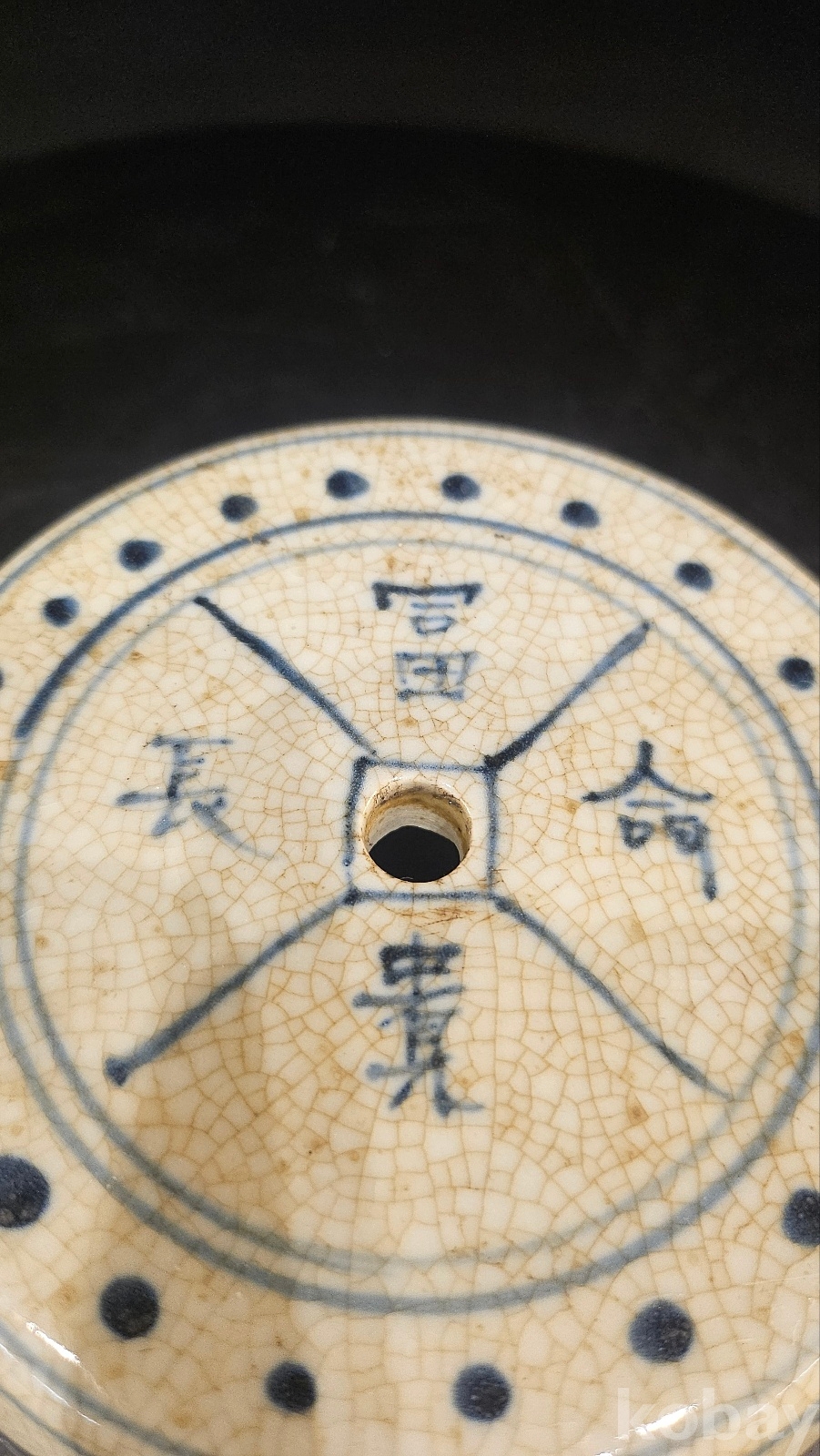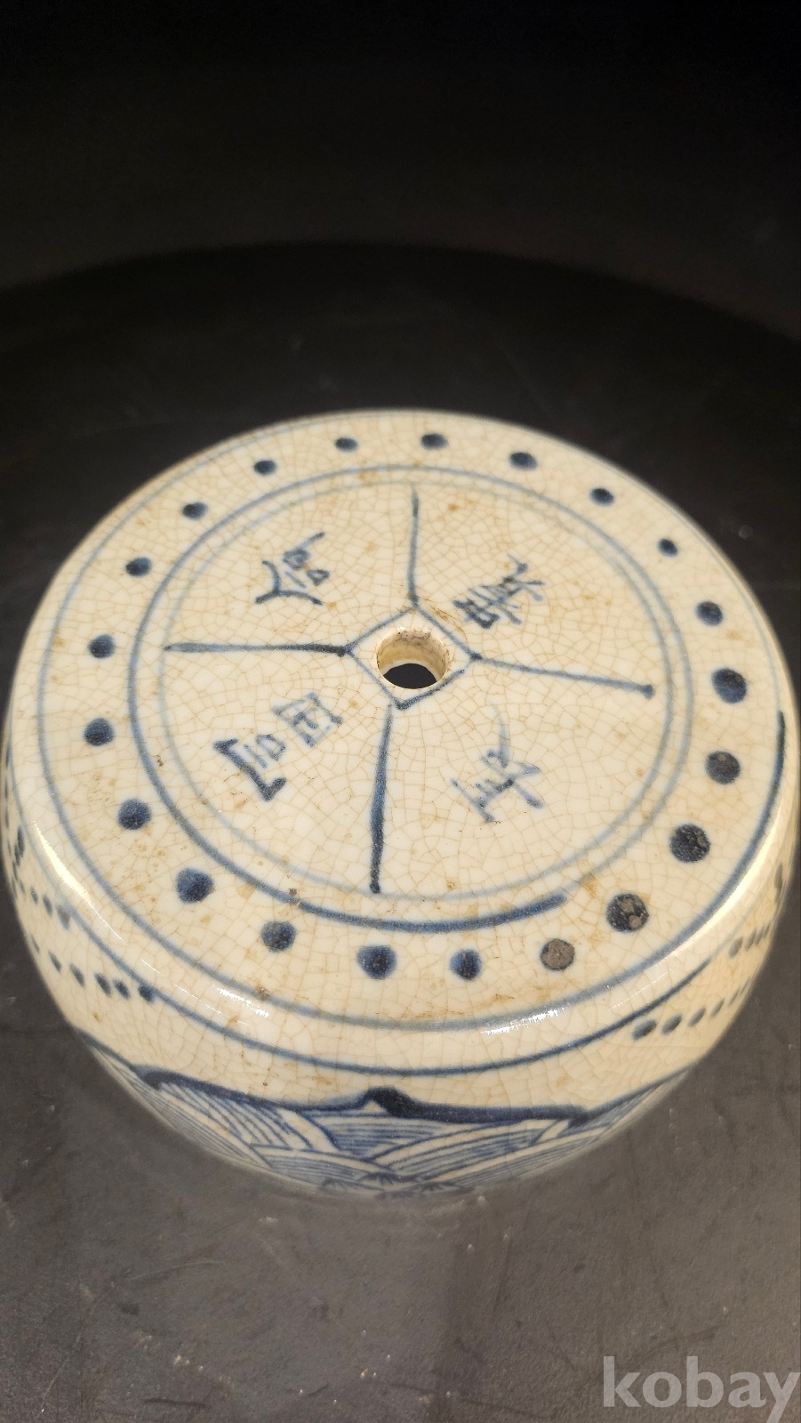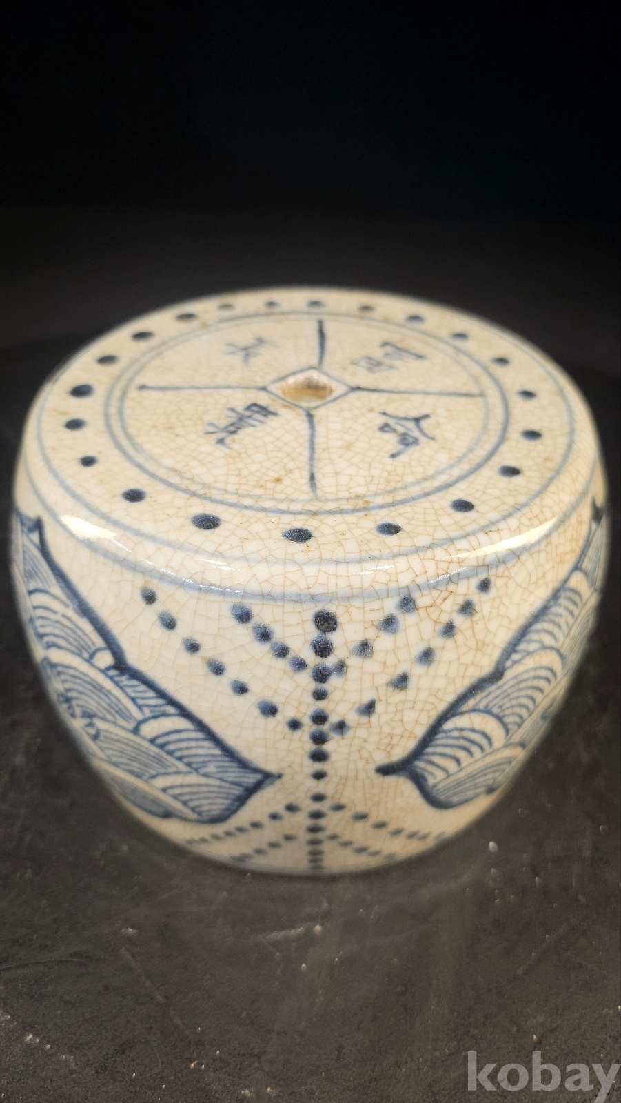 높이 8 구멍이 1개이고 도교용 기물이다 몸통문양- 연화 해수 점묘(별자리) 도교, 풍수 기운조절문양 굽에 천자는 천지기운을 연결하는 기물을 뜻한다 명말~청초(17세기 전후)나 강희 초에 나타난 형태이다 도교재단 법구이다- 일반향로보다 희귀한 기물이다