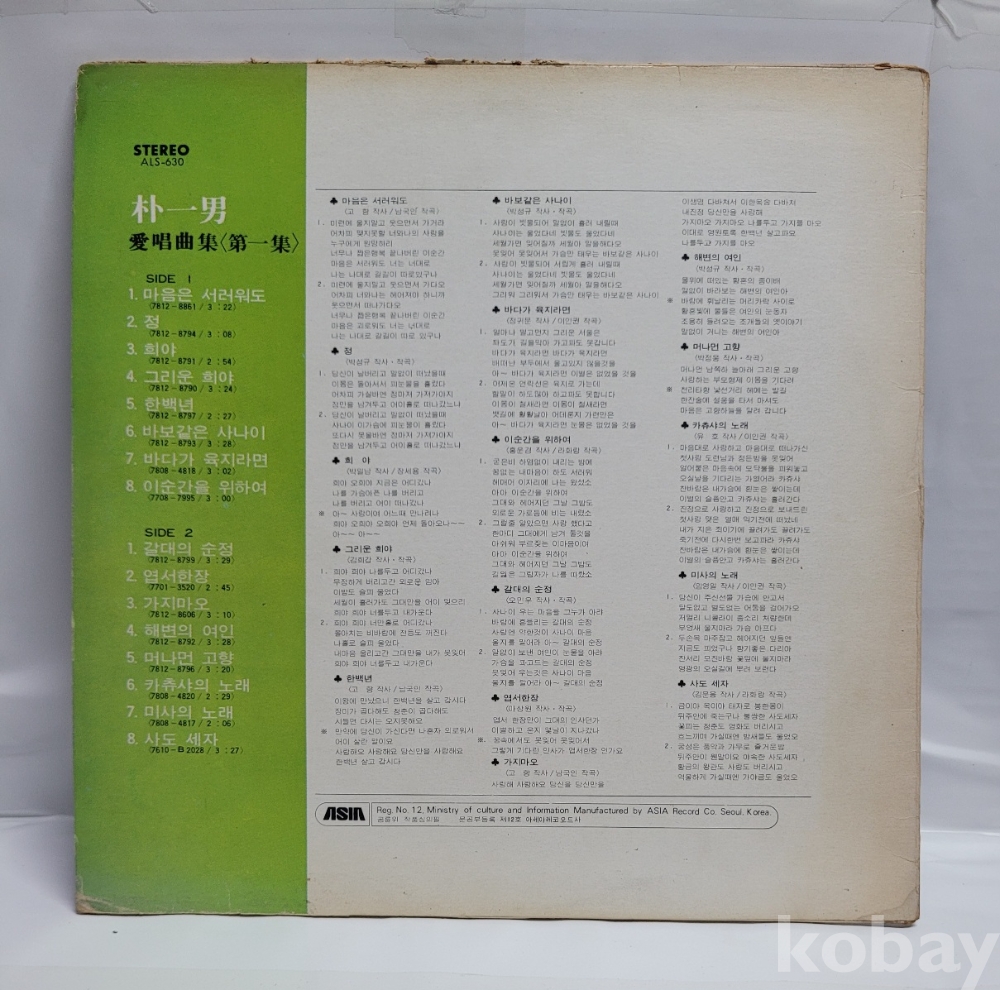 | 자켓상태 | VG : 주름, 접힘, 모서리 찢김 다수 | 음반상태 | EX : 재생에 영향 없는 가벼운 기스 존재 | 발매정보 | 초반 | 가사지여부 | 유 |