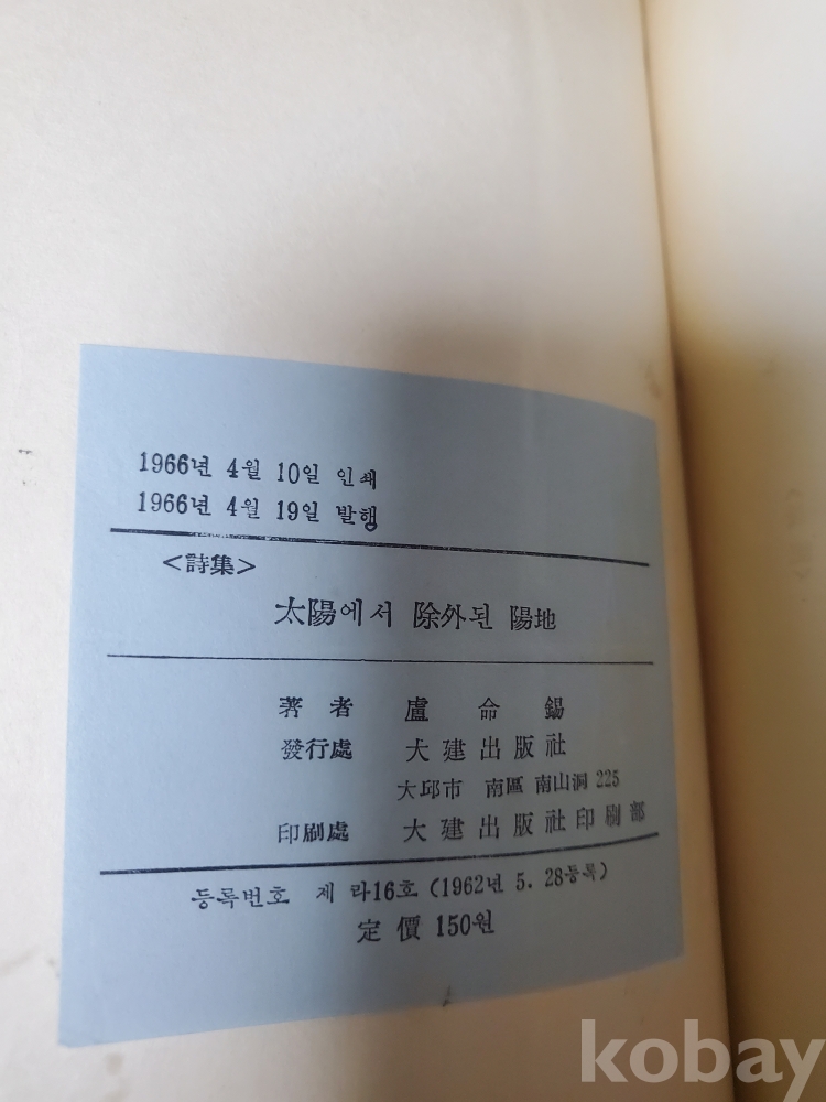 1. 태양에서 제외된 양지, 노명석, 대건출판사, 1966년, 86쪽, 상태 상, 사진 참조