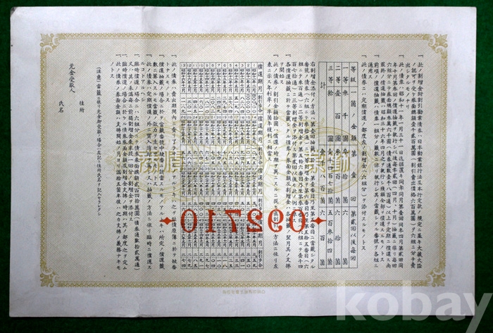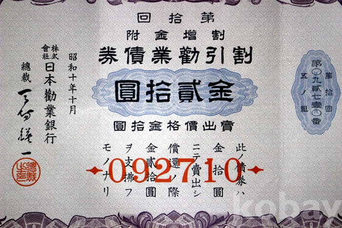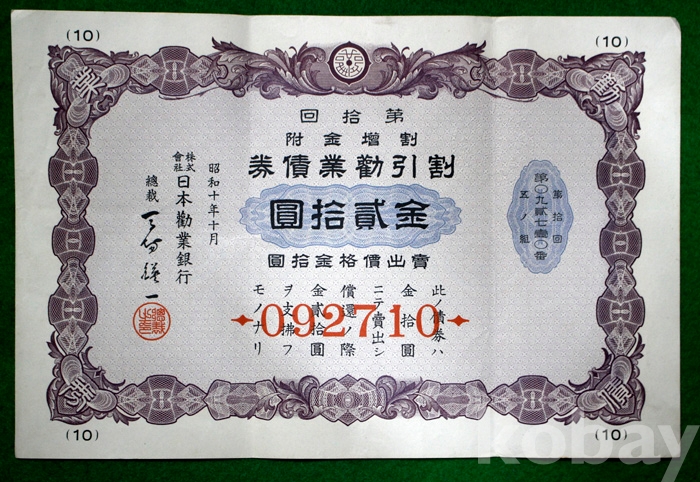 1935년 일본근업은행의 제10회 할증금부 할인근업채권 : 金 20원