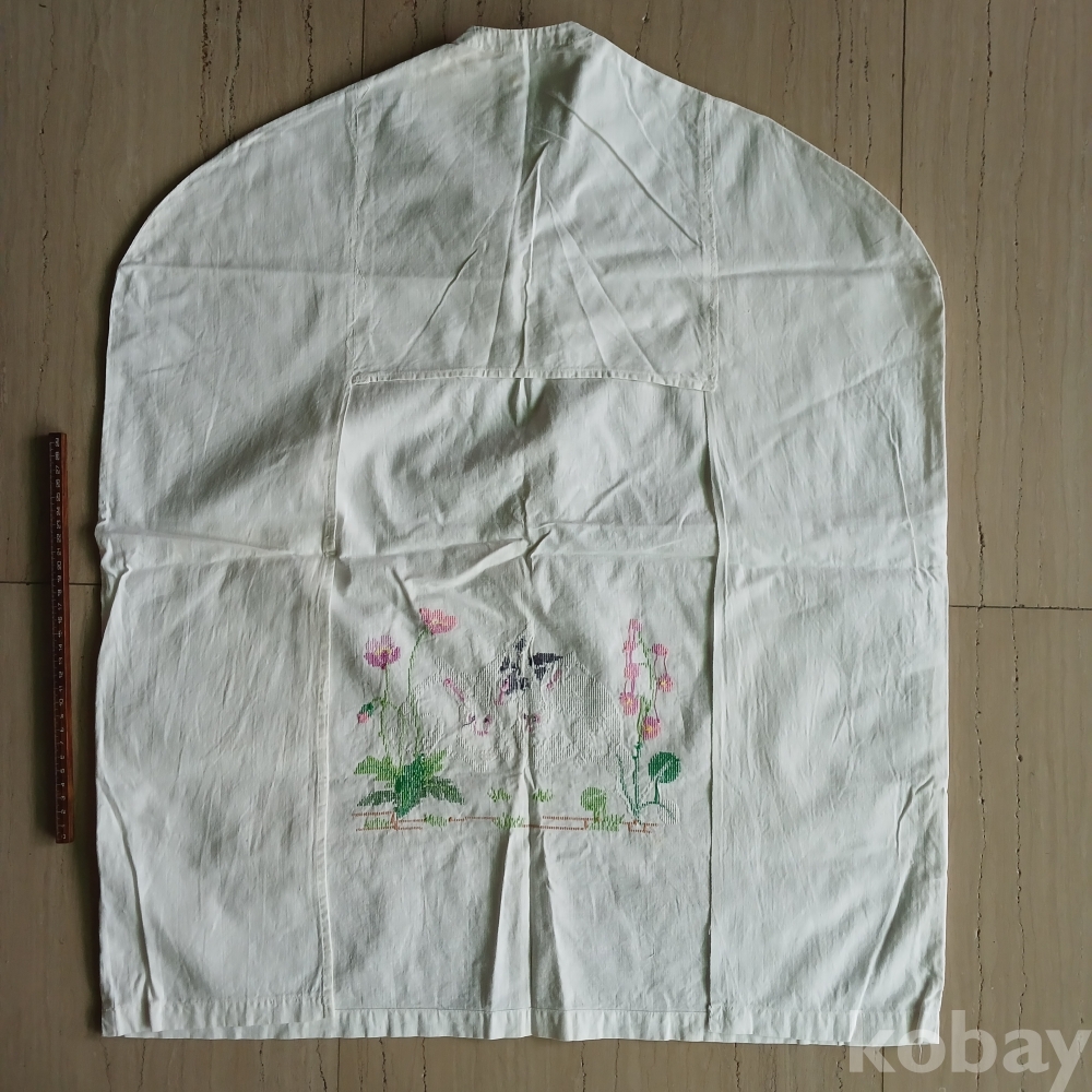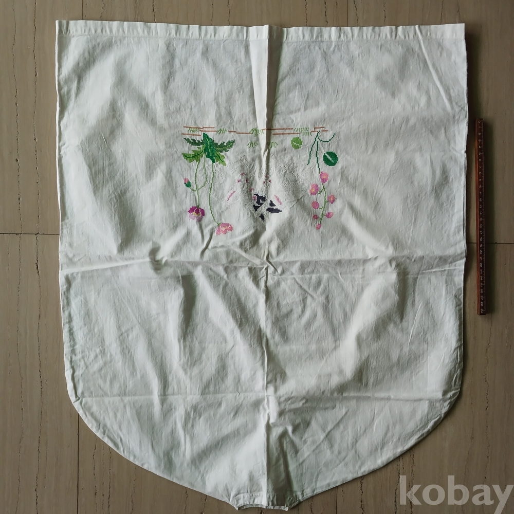 해방이 됨과 동시 우리 자수는 전통자수에서 벗어나 유럽이나 미국쪽에서 유입된 자수기법이 온 나라에 유행했던 시절이 있었지요 ᆢ 세탁이 가능하고 광목흰바탁에 다양한 도안으로 아름다움을 표현 할 수있었지요 그때 유물을 상태좋은것만 선별하여 수집 해왔던 작품의 양복 커버입니다 벽에 걸어두면 그 자체만도 아름다운 작품입니다ㆍ 그 공력은 값으론 계산 되지않은 노력의 결과물입니다 ᆢ