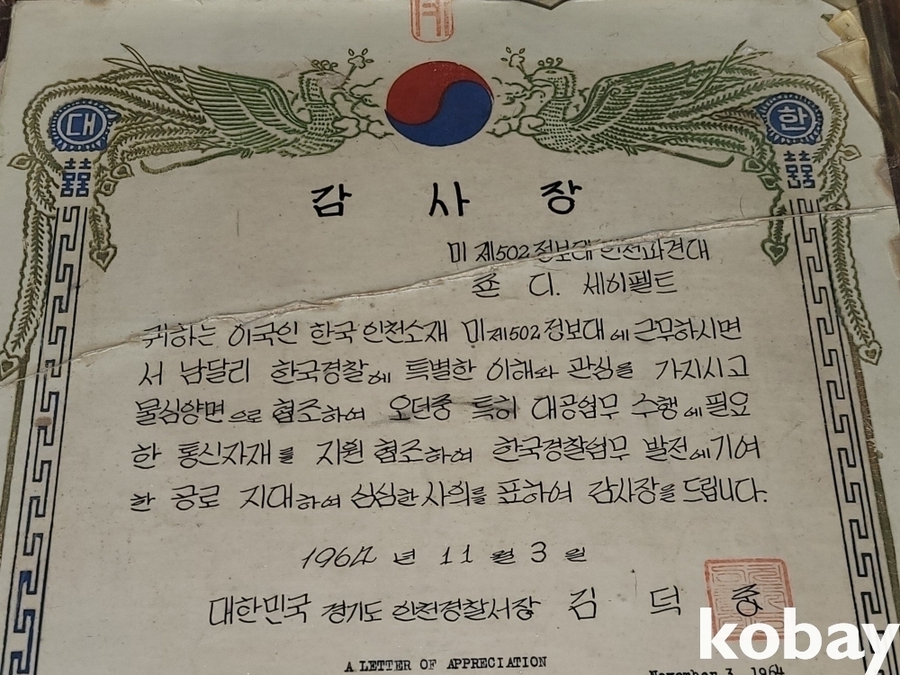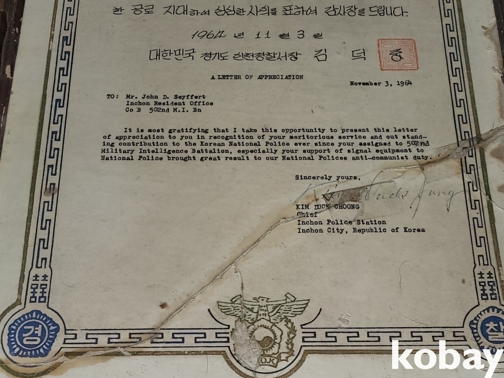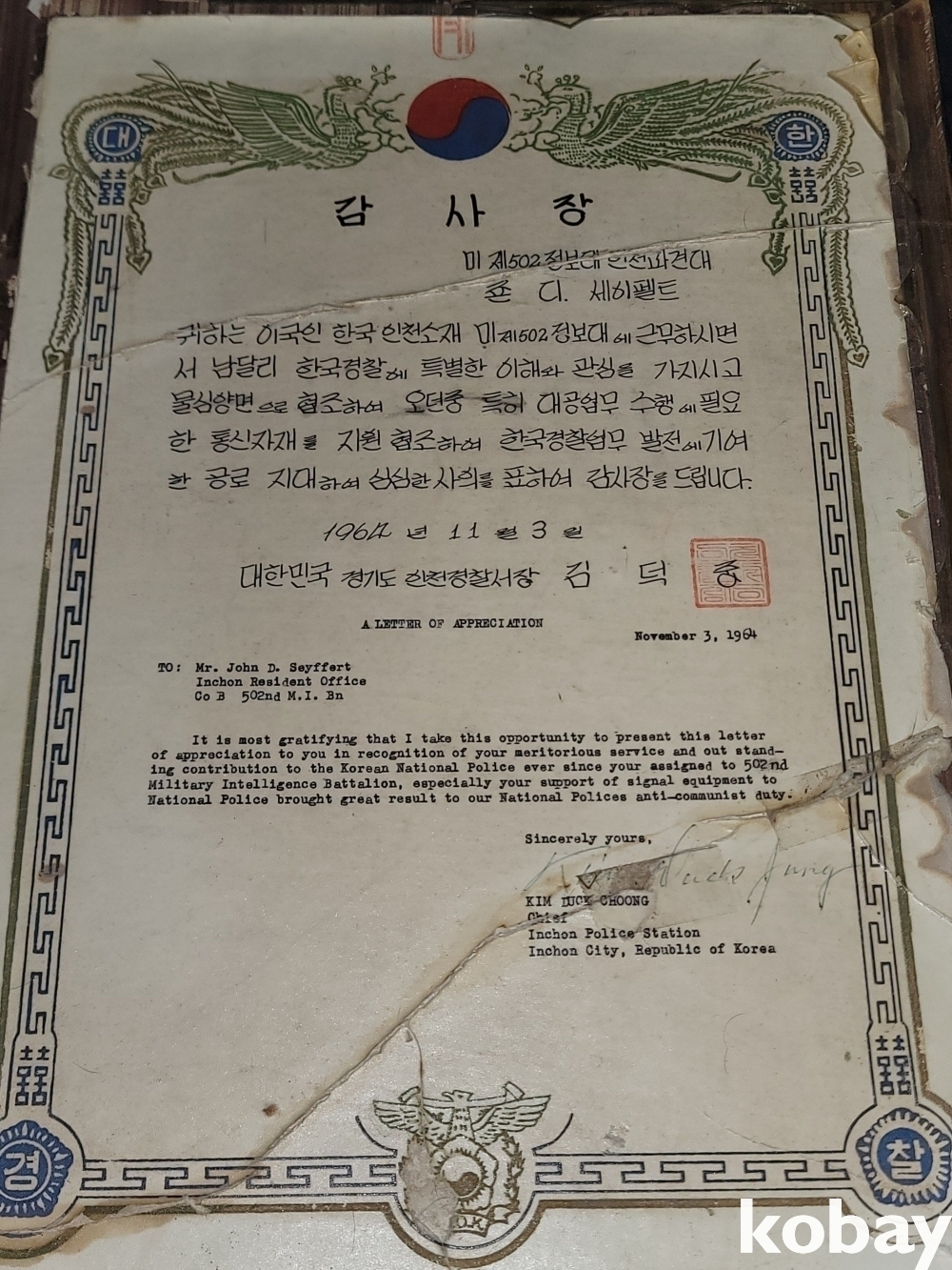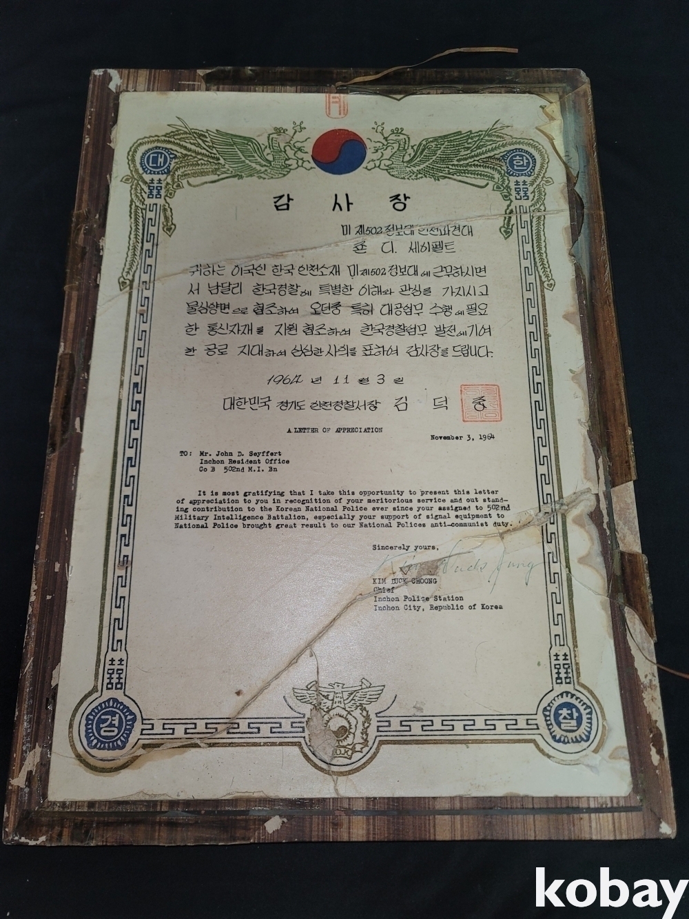 빈티지 세월 감이 느껴지는 1964년 인천경찰서장 수여 미제502정보대(미국 육군 502군사정보단) 감사장 액자 패입니다.