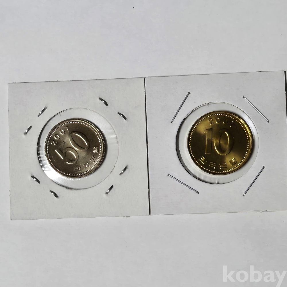 민트세트에서 꺼낸 = 한국은행 현행동전 50원 .10원 ==2001년 민트세트에서 꺼낸 완전미사용 주화 2점
