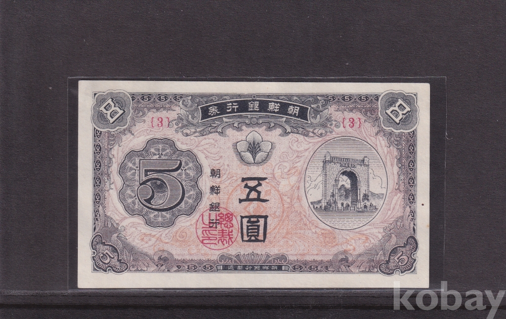 - 조선은행 1949년 독립문 신 오원 판번호 3번 미사용 (-) 지폐