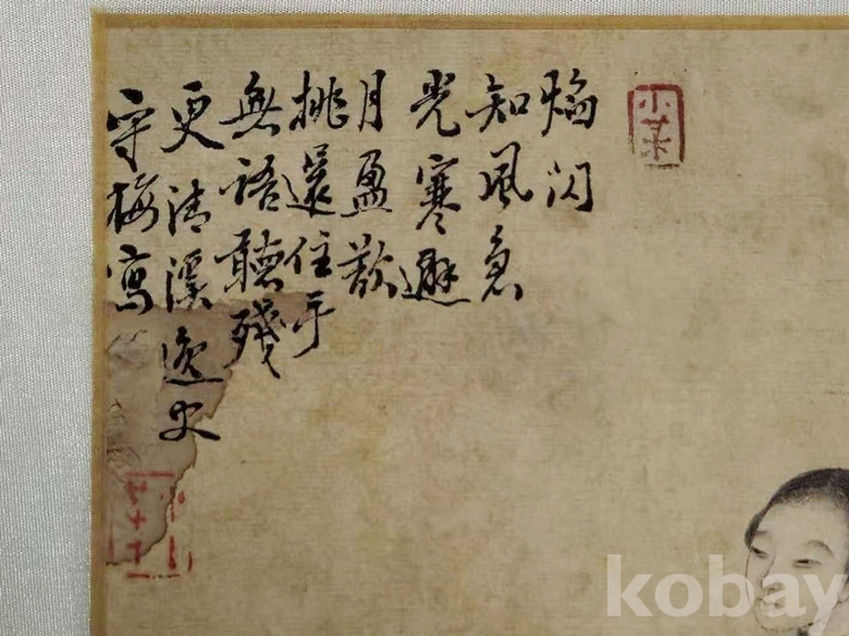 당시 유리액자 안에서 습기와 변성으로 배접 좌상변 테두리비단이 매우 낡고