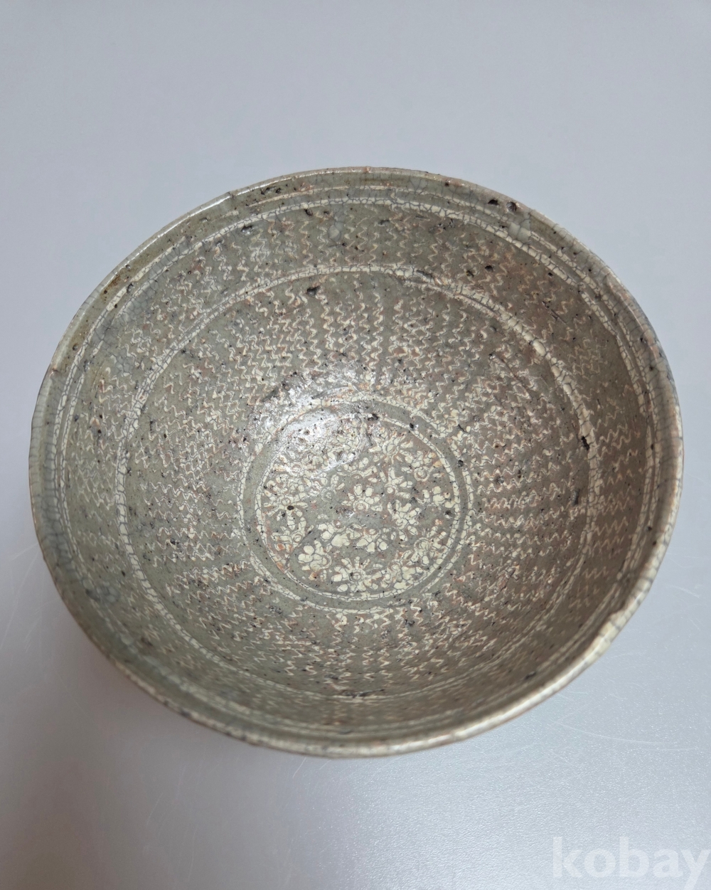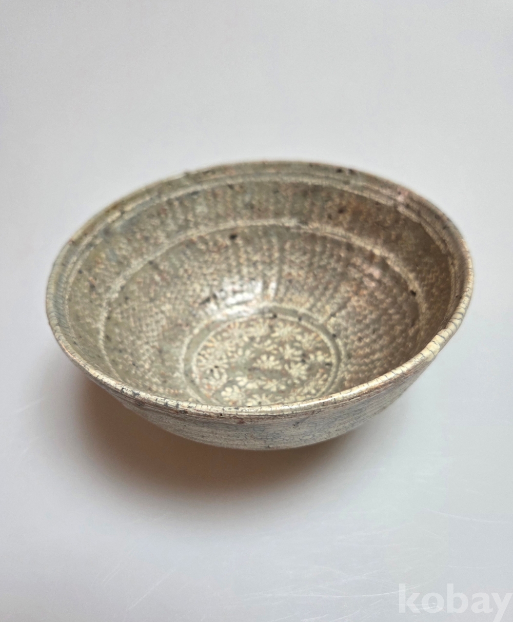 조선시대 분청귀얄인화국화문 다완으로 외면에는 거침없는 귀얄 기법을 내면에는 국화.승렴.선문을 순차적으로 인화하여 두 가지 기법을 조화롭게 구사한 완성도 높은 작품입니다