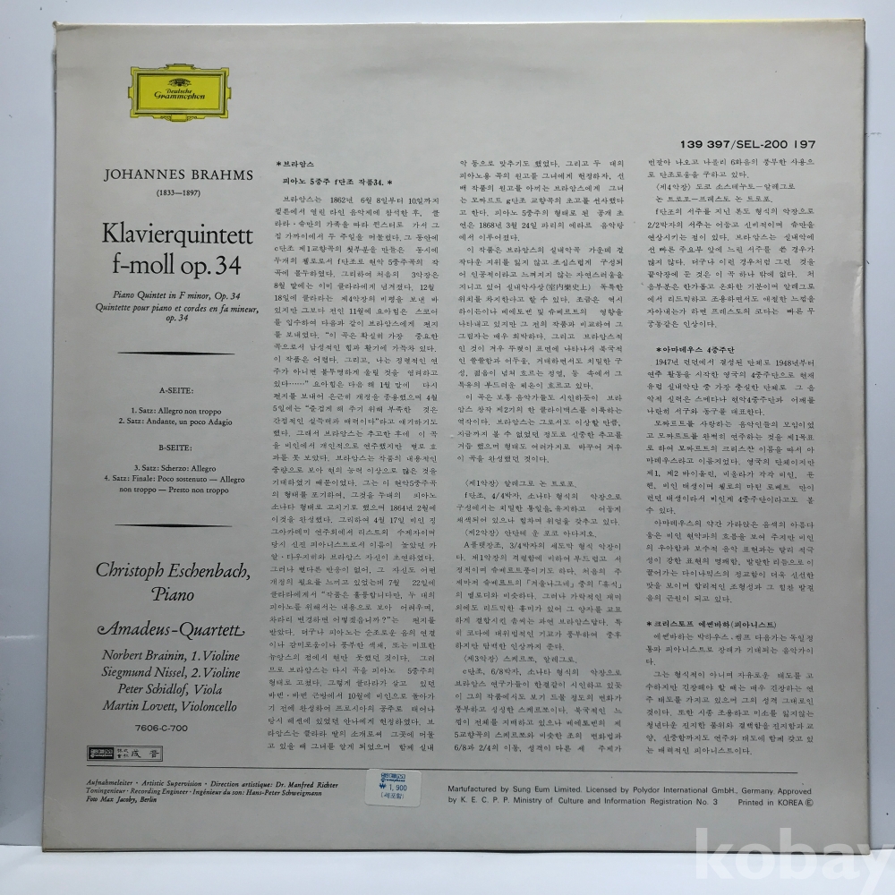 LP 10,400-58 Eschenbach - Brahms Klavierquintett _ 자켓 EX+ 알판 EX+ 76 년 국내반