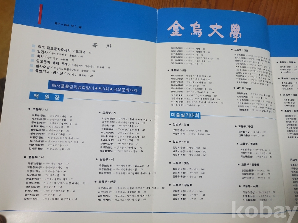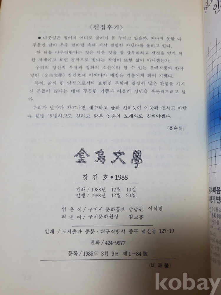1. 금오문학 창간호, 구미문화원, 도서출판 중문, 1988년, 320쪽, 비매품, 상태 상, 사진 참조