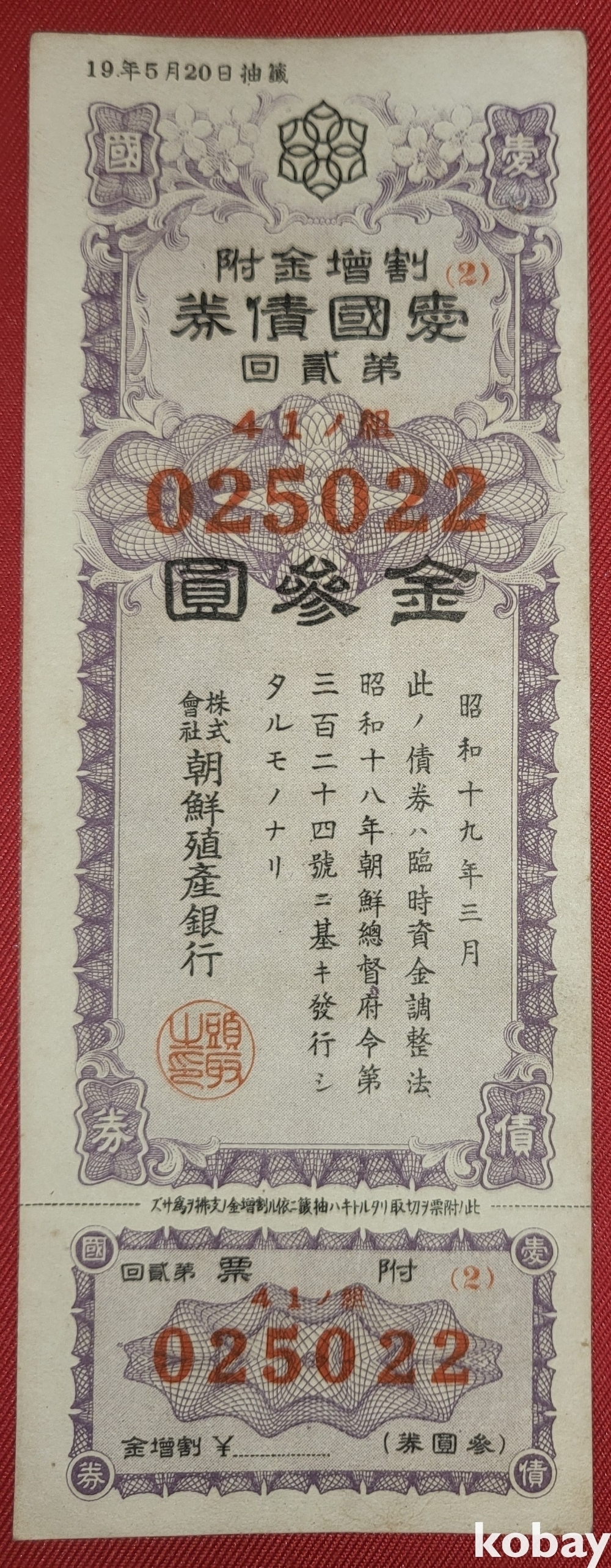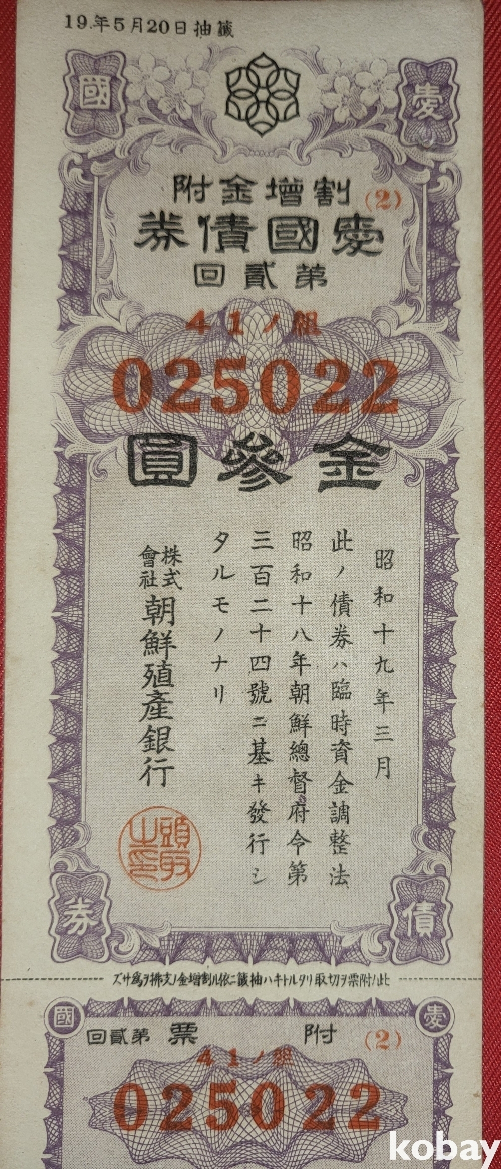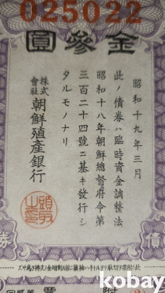주식회사 조선 직산은행 소하19년(1943년) 발행된 할증금부(割增金附)입니다,