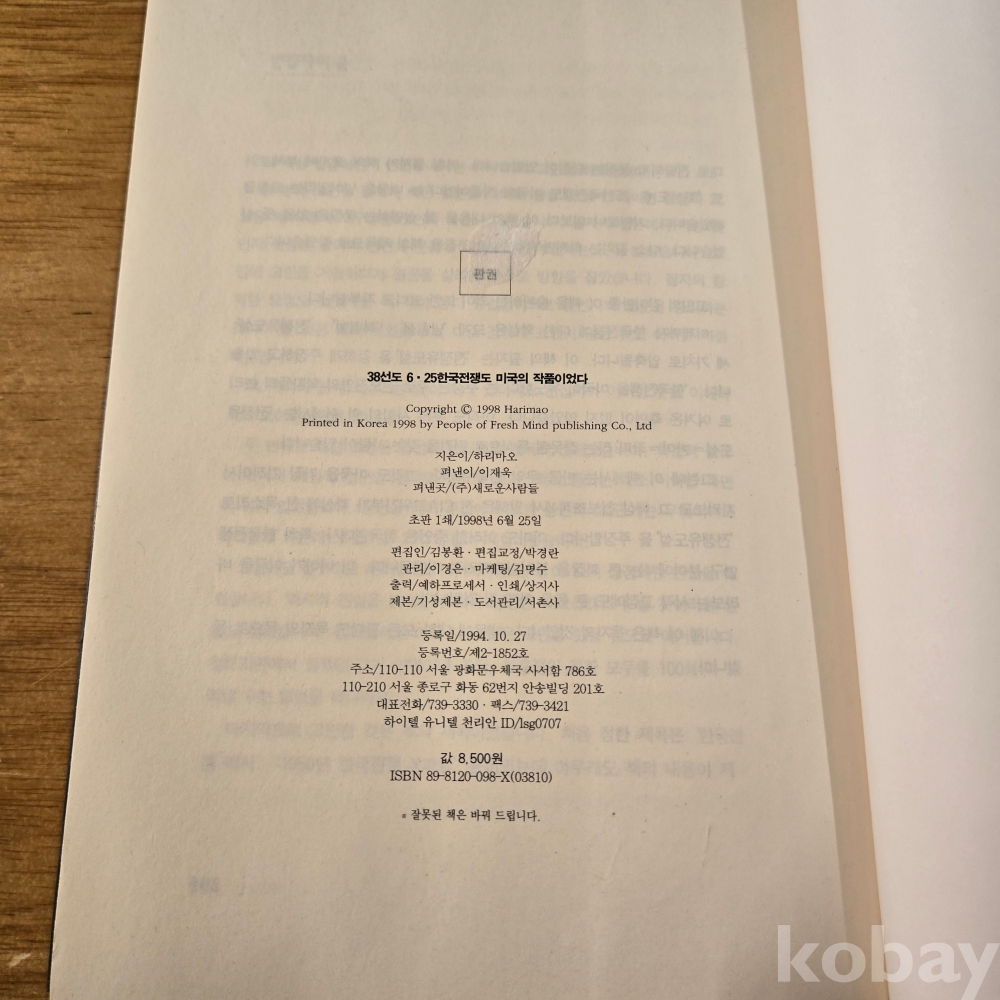 [희귀본, 한국현대사, 분단, 6.25전쟁] 하리마오, <38선도 6.25 한국전쟁도 미국의 작품이었다>, 새로운사람들, 1998, p. 295, 상태 중급(사진참조)