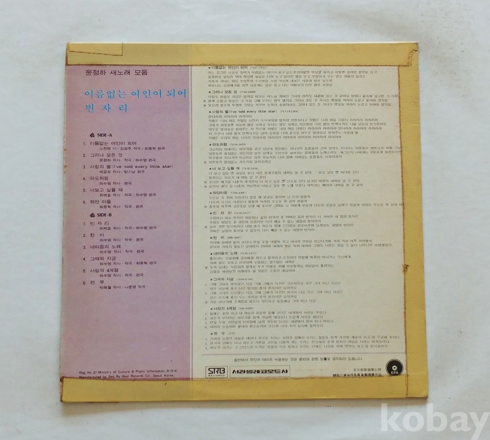 | 자켓상태 | VG : 주름, 접힘, 모서리 찢김 다수 | 음반상태 | EX : 재생에 영향 없는 가벼운 기스 존재 | 발매정보 | 알수없음 | 가사지여부 | 무 |
