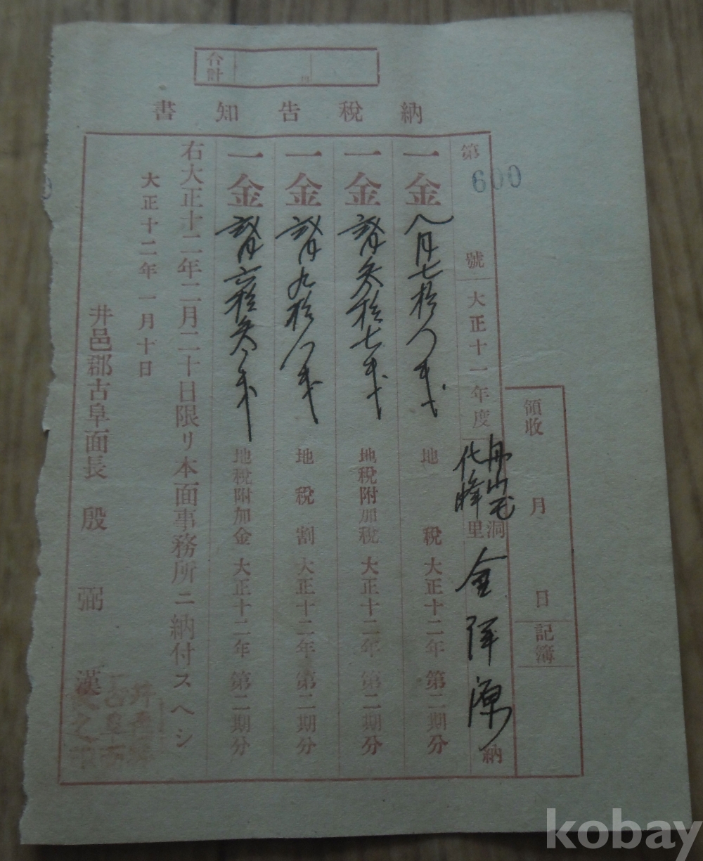대정12년 정읍군고부면 발행 납세고지서