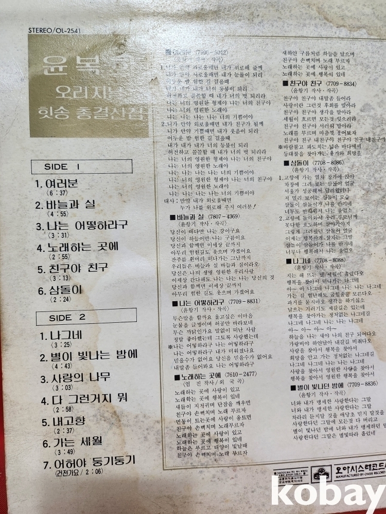 | 자켓상태 | EX : 약간의 마모, 모서리 찢김 존재 | 음반상태 | VG : 생활 기스 다수, 가벼운 노이즈 존재 | 발매정보 | 알수없음 | 가사지여부 | 유 |