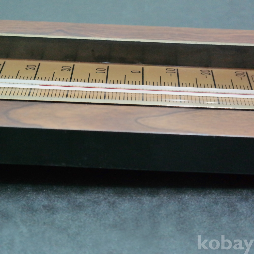몸통이 프라스틱으로 만들어진 오래된 나뭇결문양 온도계 입니다.