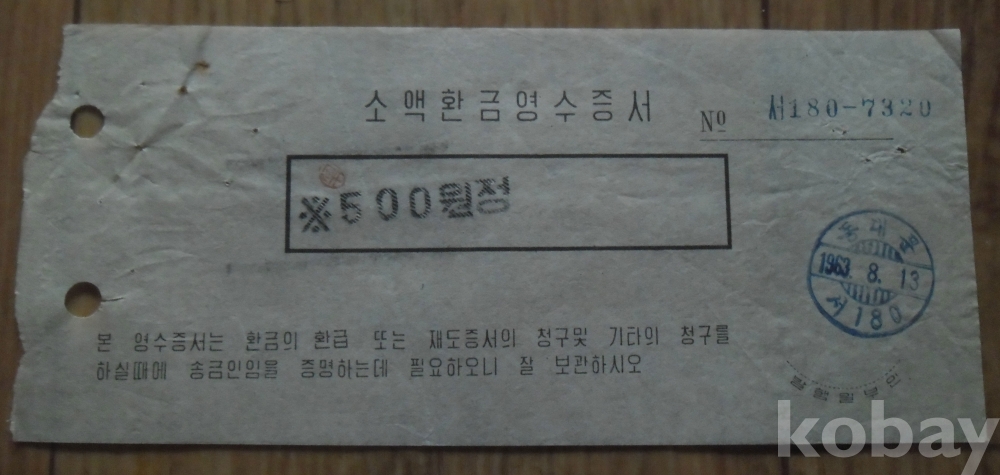 1963년 소액환금 영수증서