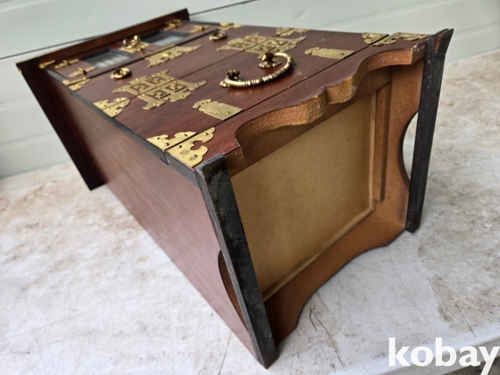 동 장식에 앞닫이, 2칸의 서랍이 있는 장식장 입니다.