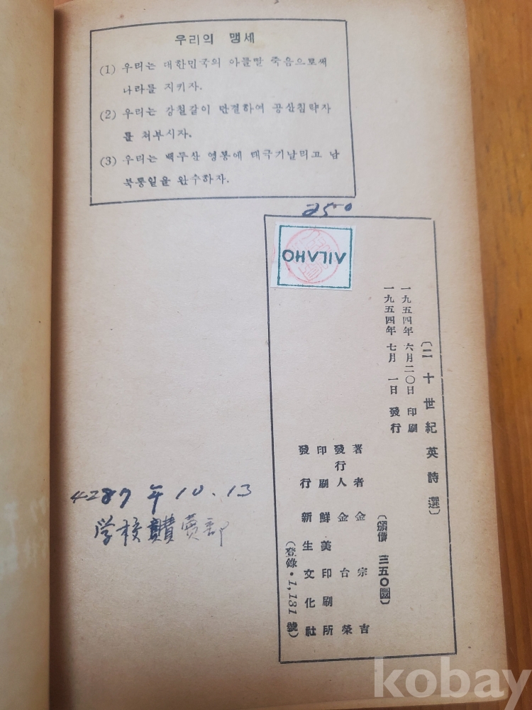 1. 20세기영시선, 김종길, 신생문화사, 1954년, 272쪽, 상태 상, 사진 참조