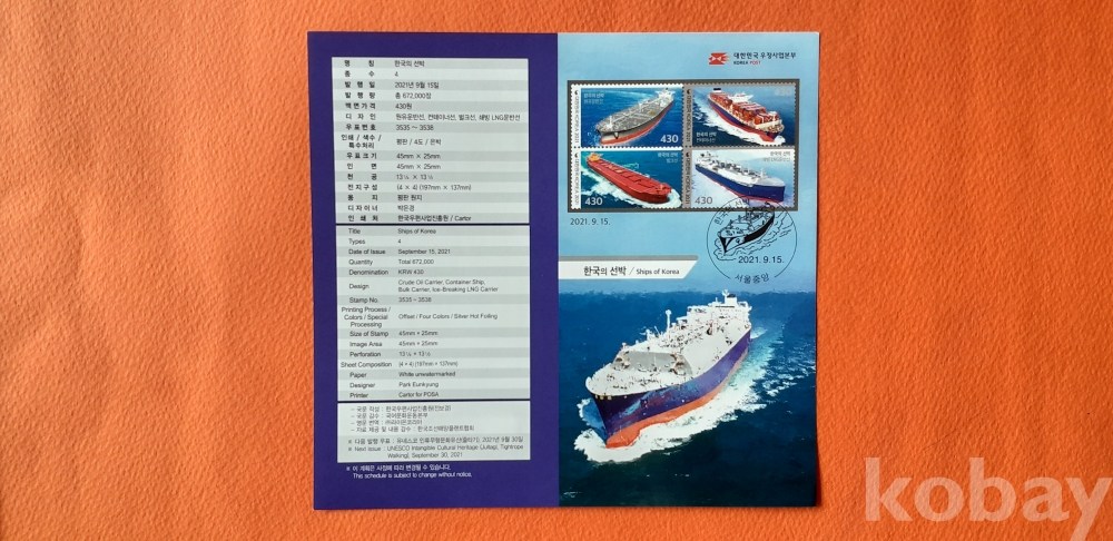2021년 430원 한국의 선박 16매 전지(안내카드 포함) 입니다.