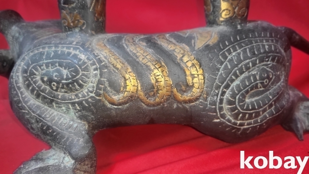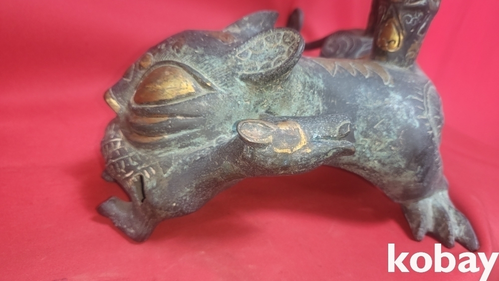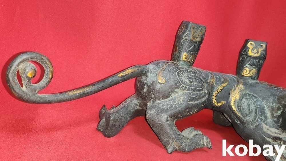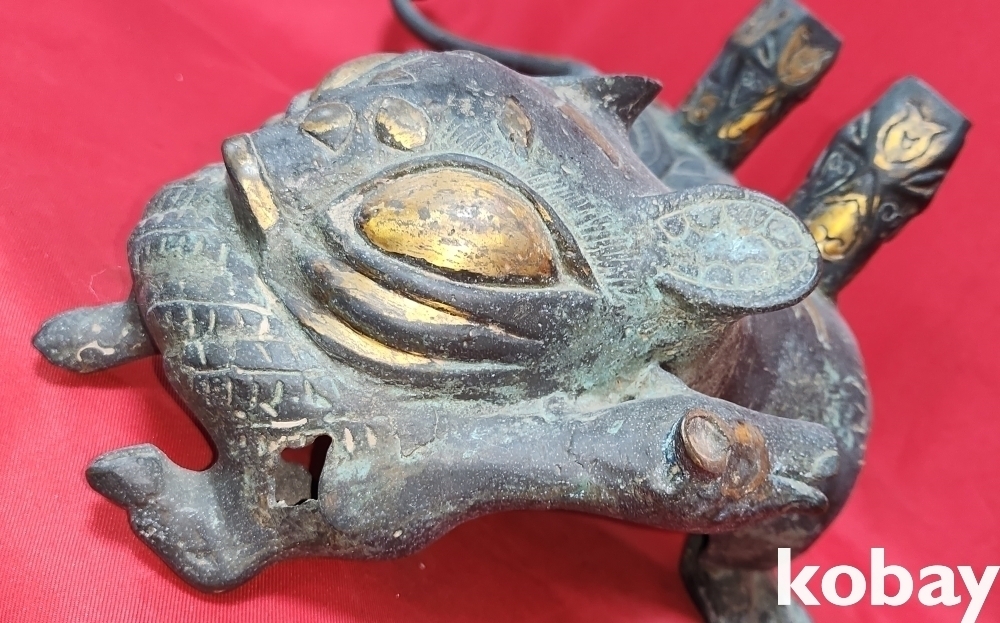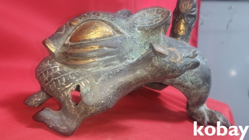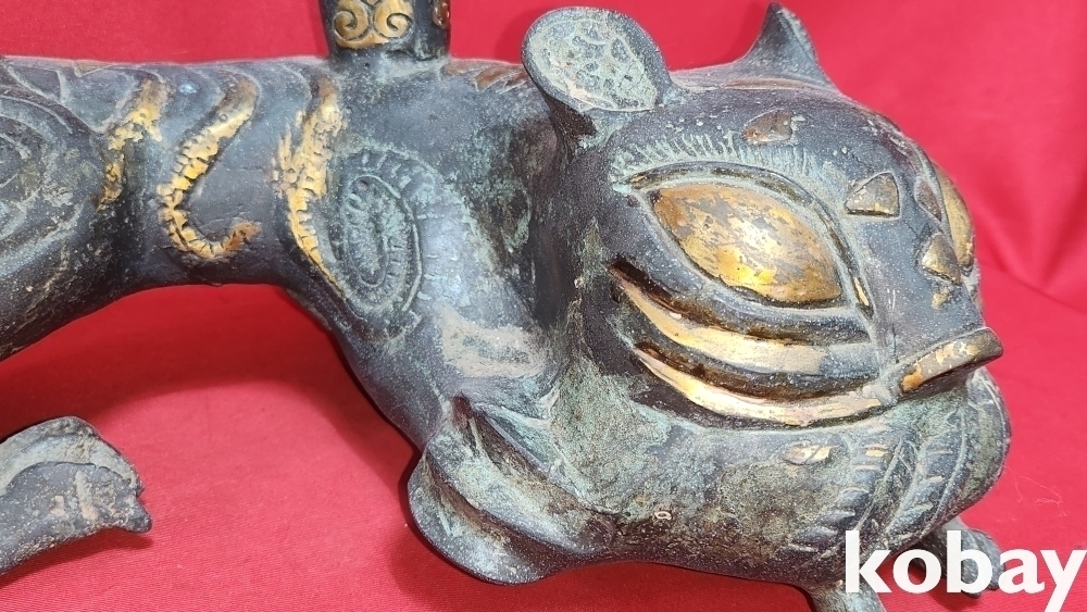 300년 이상의 연대 갖춘 묘금으로 장식한 금동 서수瑞獸), 문양 기물입니다,