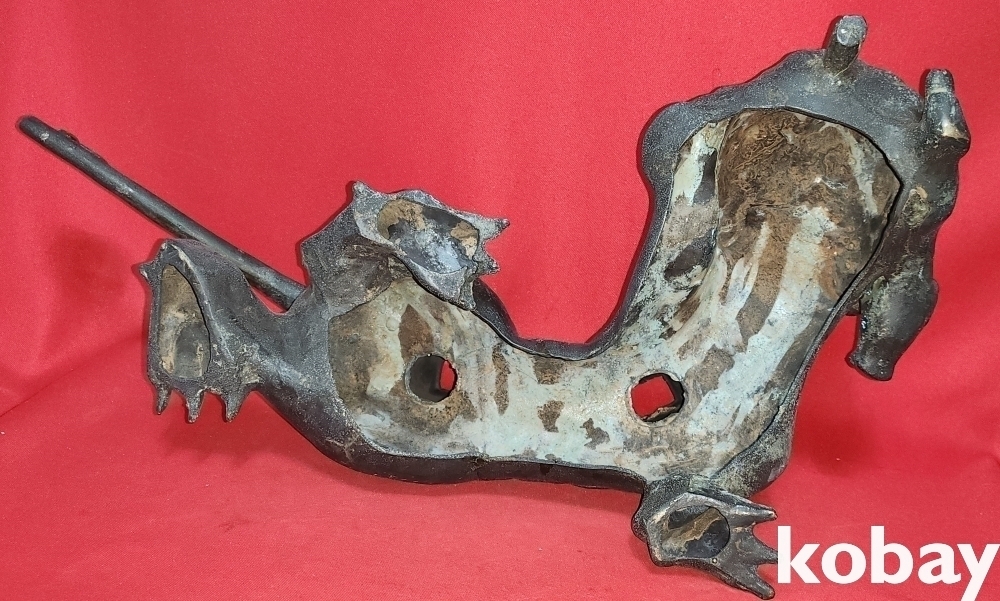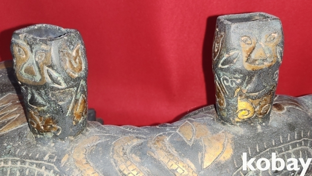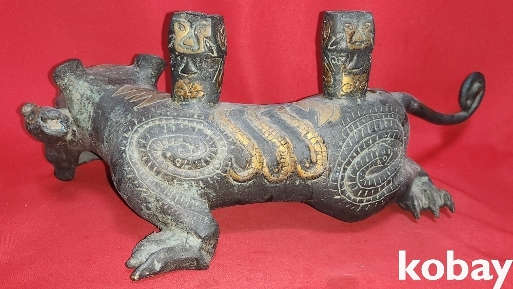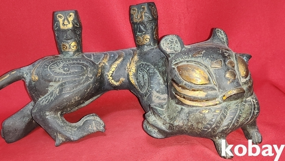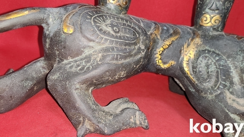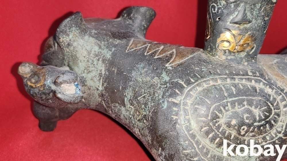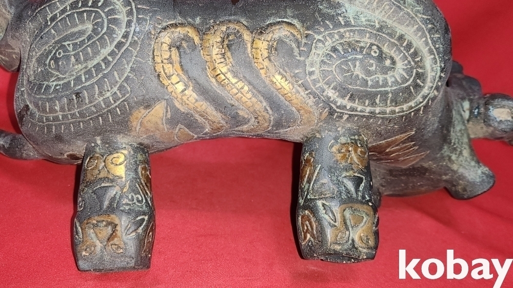 300년 이상의 연대 갖춘 묘금으로 장식한 금동 서수瑞獸), 문양 기물입니다,