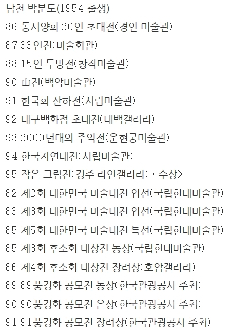 미술대전(82-85), 동특선, 후소회공모전(85장려상, 86동상), 33인초대전(87문예진흥원), 한국화전망전(90문예진흥원), 화랑기획전(87), 동.서양화20인초대전, 88한국화15인두방전, 90산전