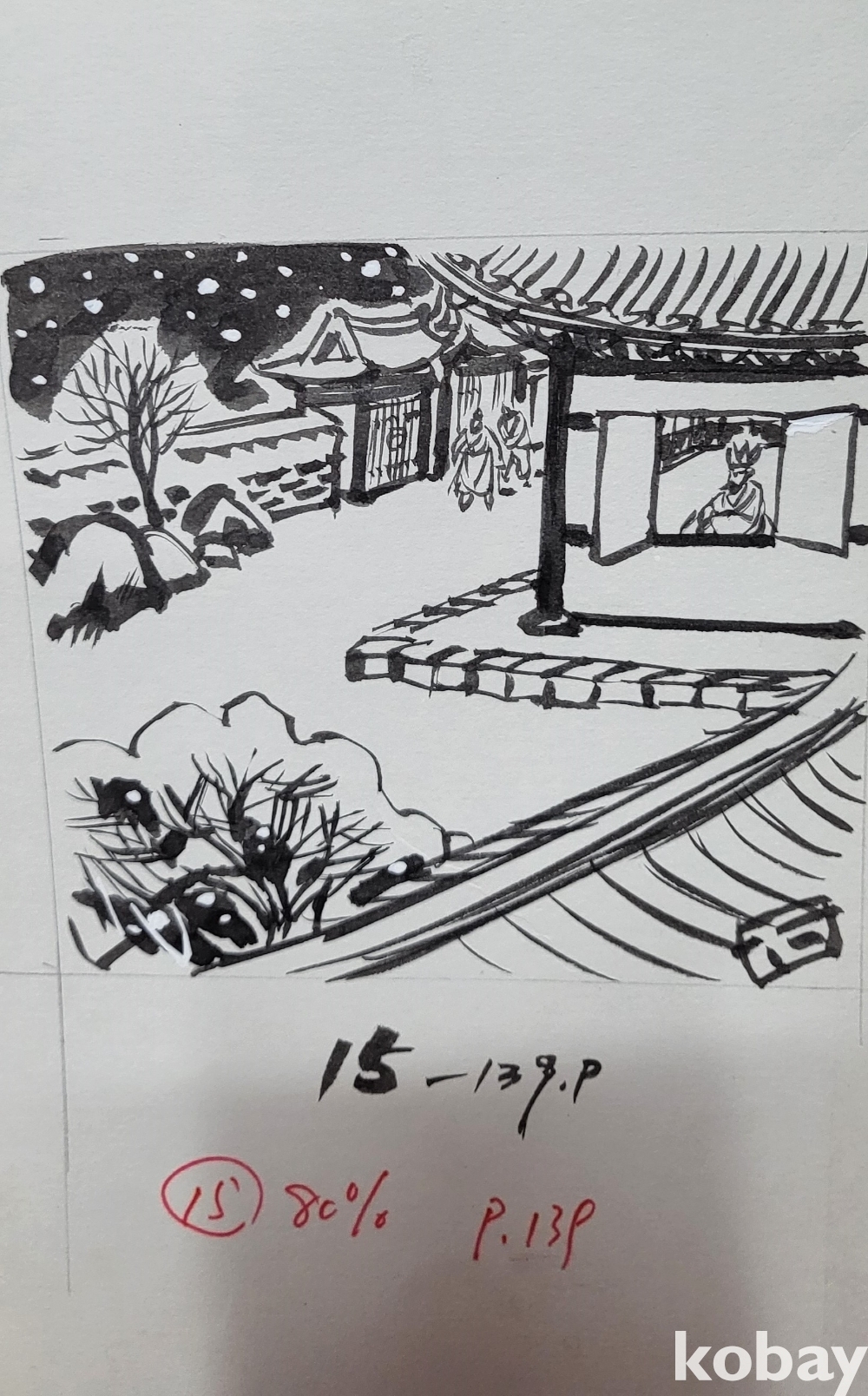 물과 먹으로 만 직접 그려진 수묵화 삽화입니다,