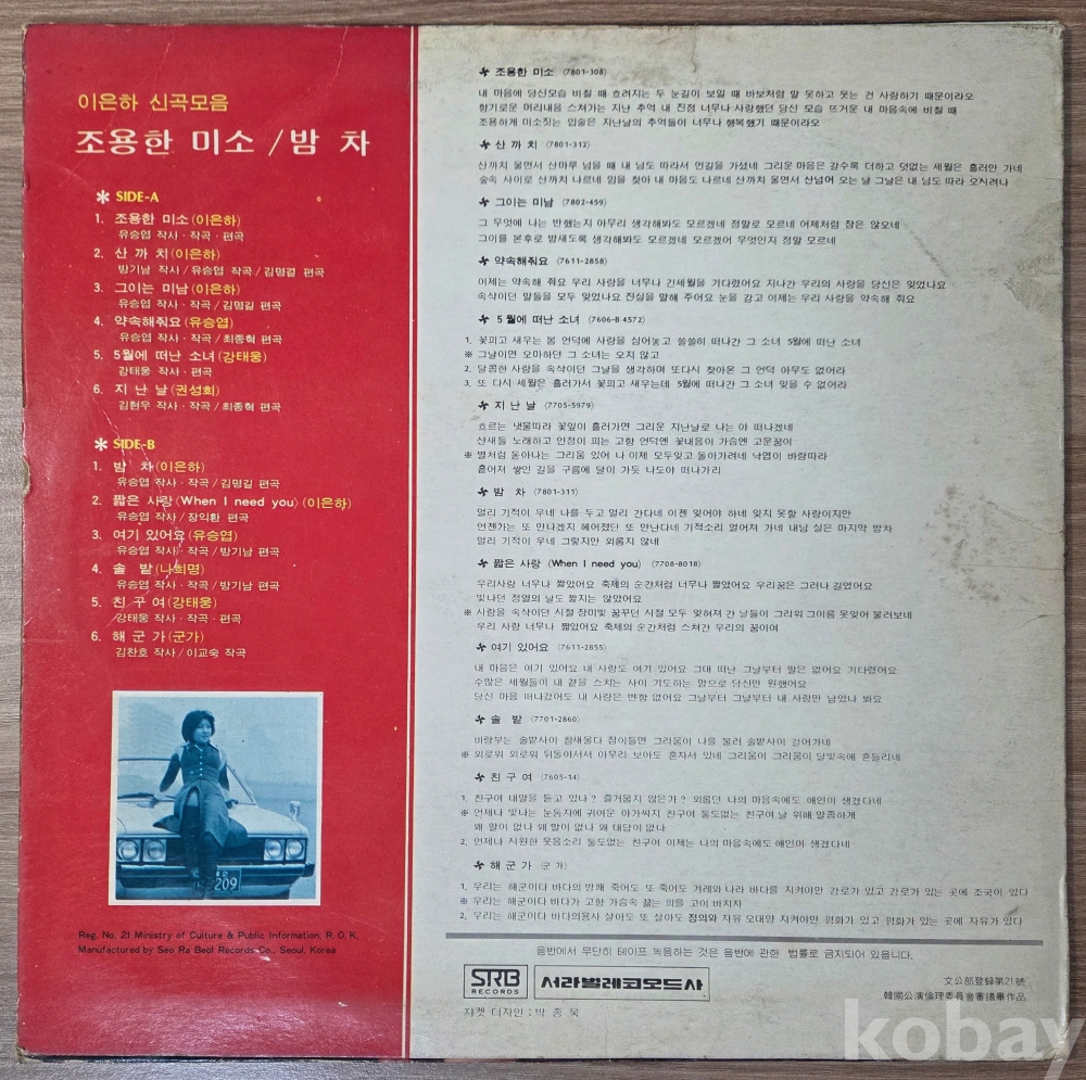 | 자켓상태 | VG : 주름, 접힘, 모서리 찢김 다수 | 음반상태 | EX : 재생에 영향 없는 가벼운 기스 존재 | 발매정보 | 알수없음 | 가사지여부 | 무 |