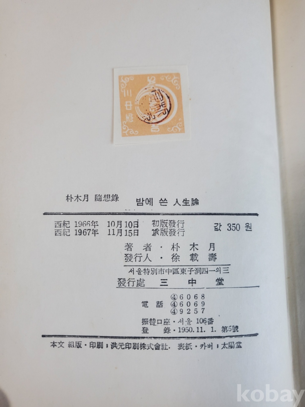 1. 밤에 쓴 인생론, 박목월, 삼중당, 1967년, 299쪽, 상태 상, 사진 참조