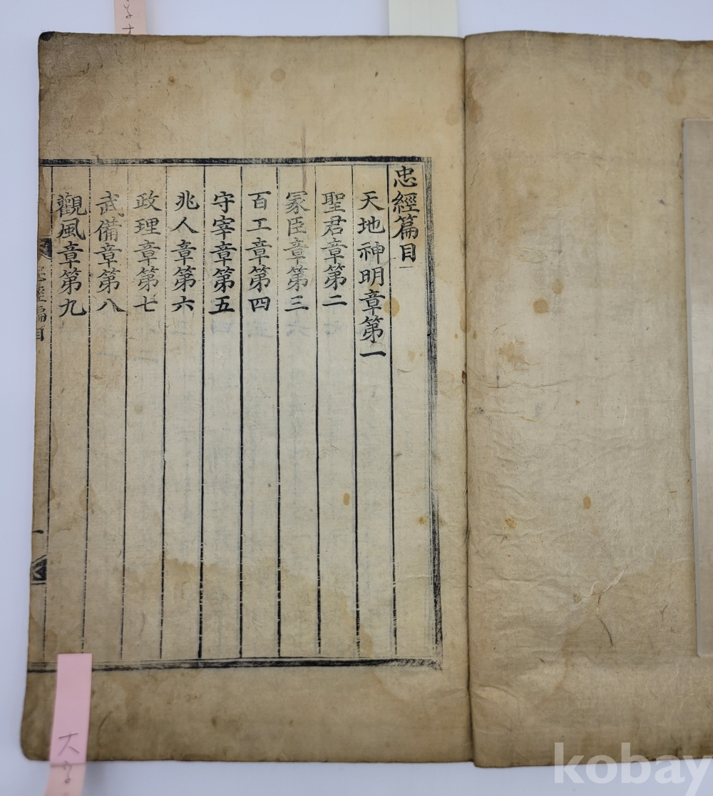 이 책에는 충성을 다함으로써 군주와 국가를 섬겨야 한다는 내용이 담겨 있다. 권두에는 1434년에 회계인 한양(韓陽)이 지은 「충경해주서(忠經解註序)」가 실려 있으며, 권말에는 한안원년(漢安元年)인 142년에 마융(馬融)이 지은 「충경서(忠經序)」가 수록되어 있다.