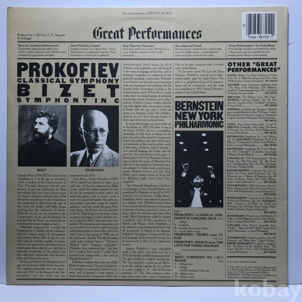 LP 83,805-22 Bernstein/NYP - Prokofiev/Bizet _ 자켓 EX+ 알판 EX 76 년 국내반