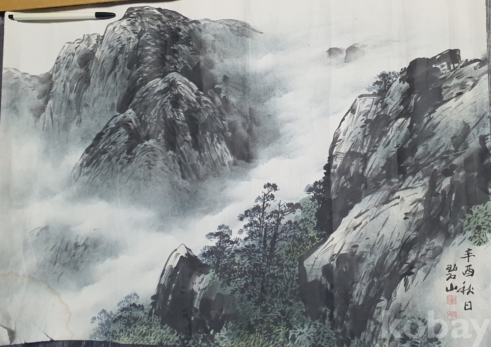국전 특선과 여러번 입선경력이 있으시고 현재 김제에서 벽산 미술관 운영하시는 강현식 화백님 운무가 넘치는 그림,, 한쪽 귀퉁이에 약간 얼룩이 있어요 사진 참조하세요..