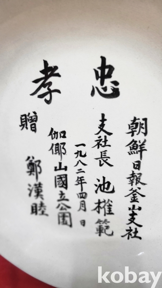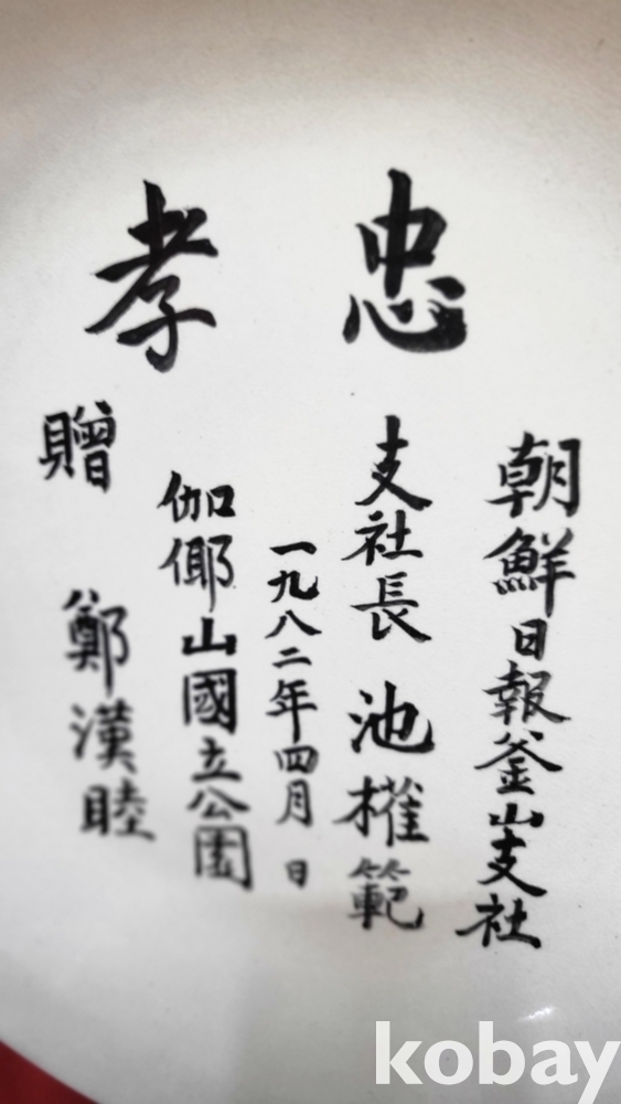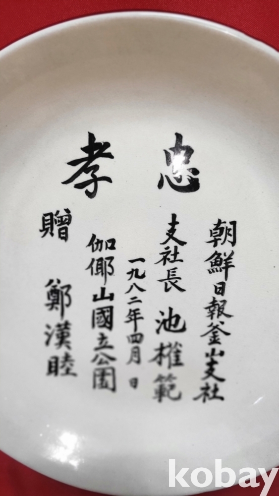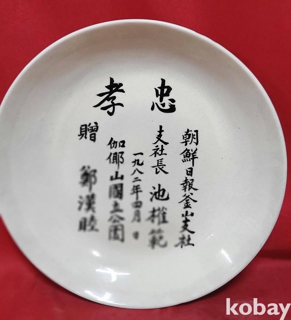 1983년作 조선일보 부산지사 지사장 지권범 께 정한목 증(贈)한 충효(忠孝) 문자 보이는 접시입니다,