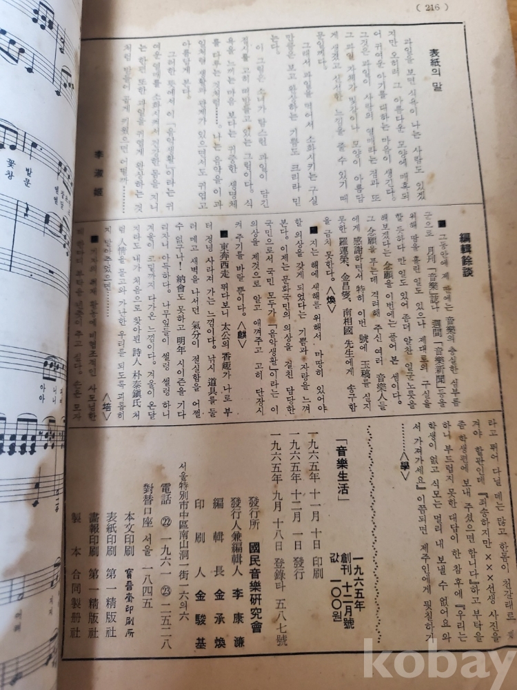1. 음악생활 창간호, 국민음악연구회, 1965년, 218쪽, 상태 상, 사진 참조