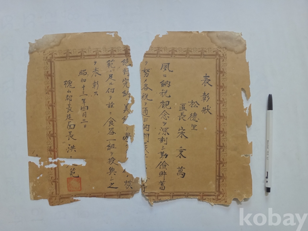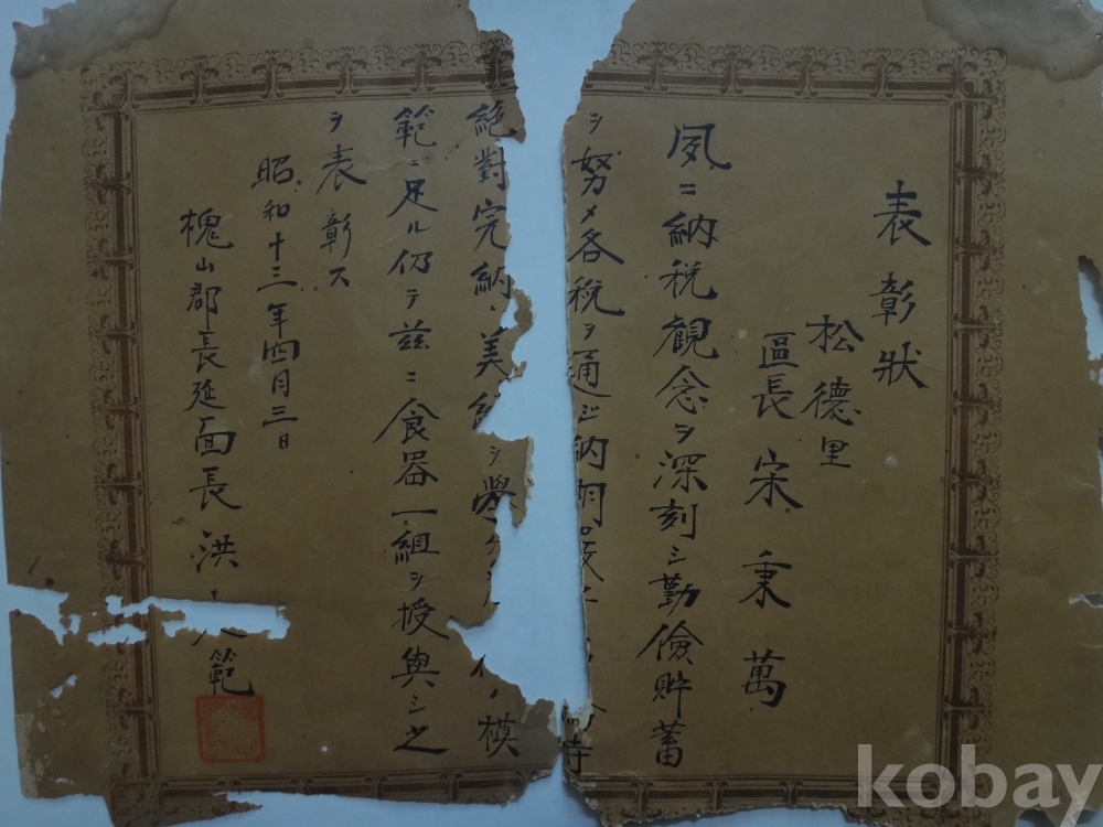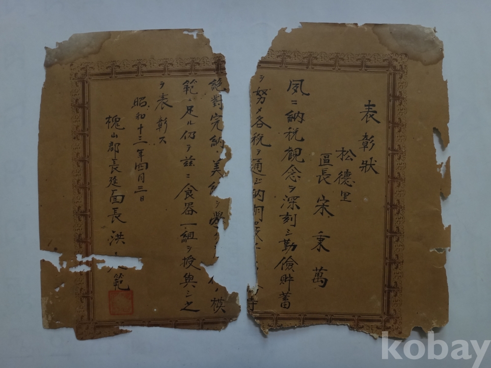 송덕리 구장 표창장 - 근검저축 절대 완납 (소화13년, 괴산군 장연면장)