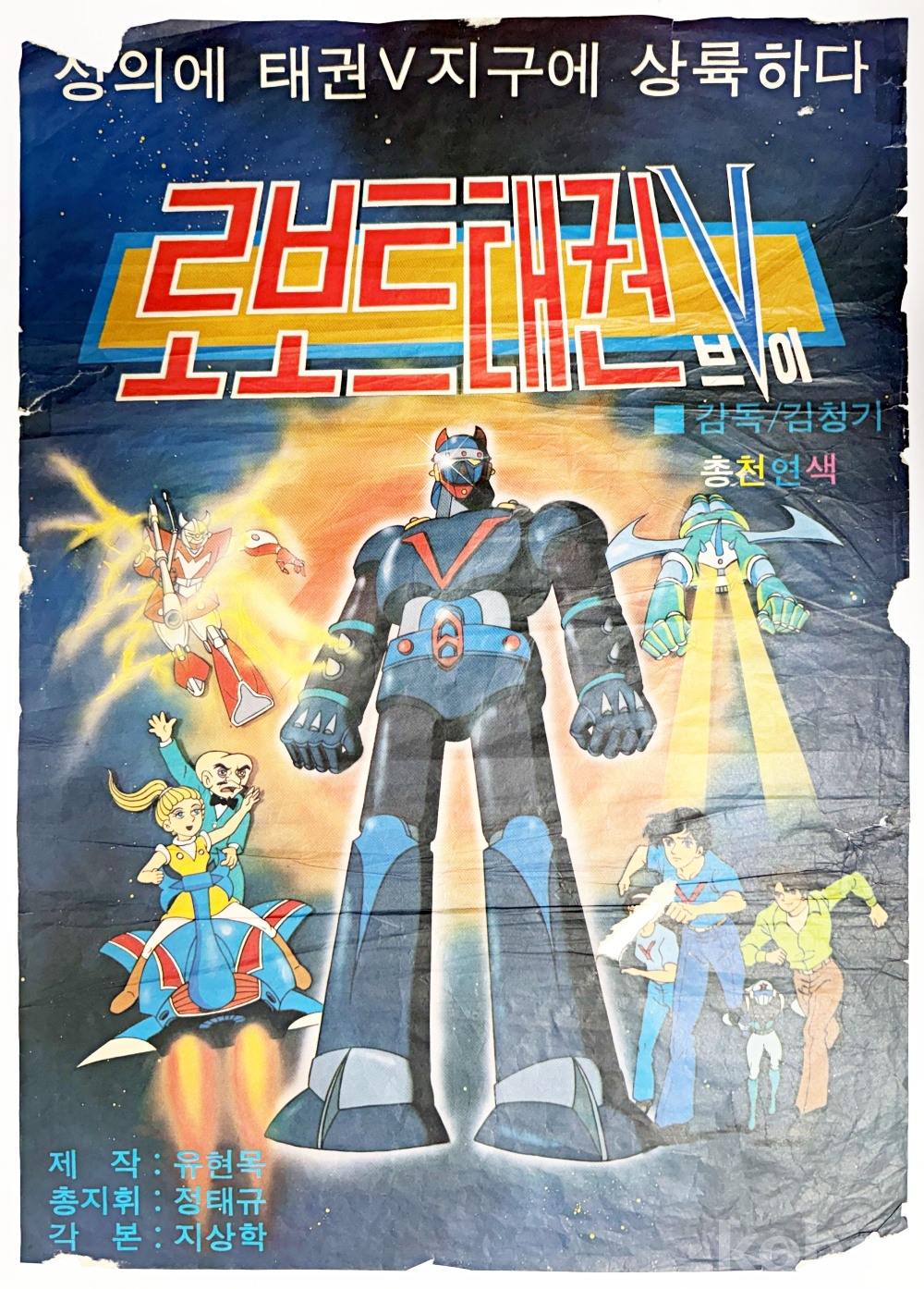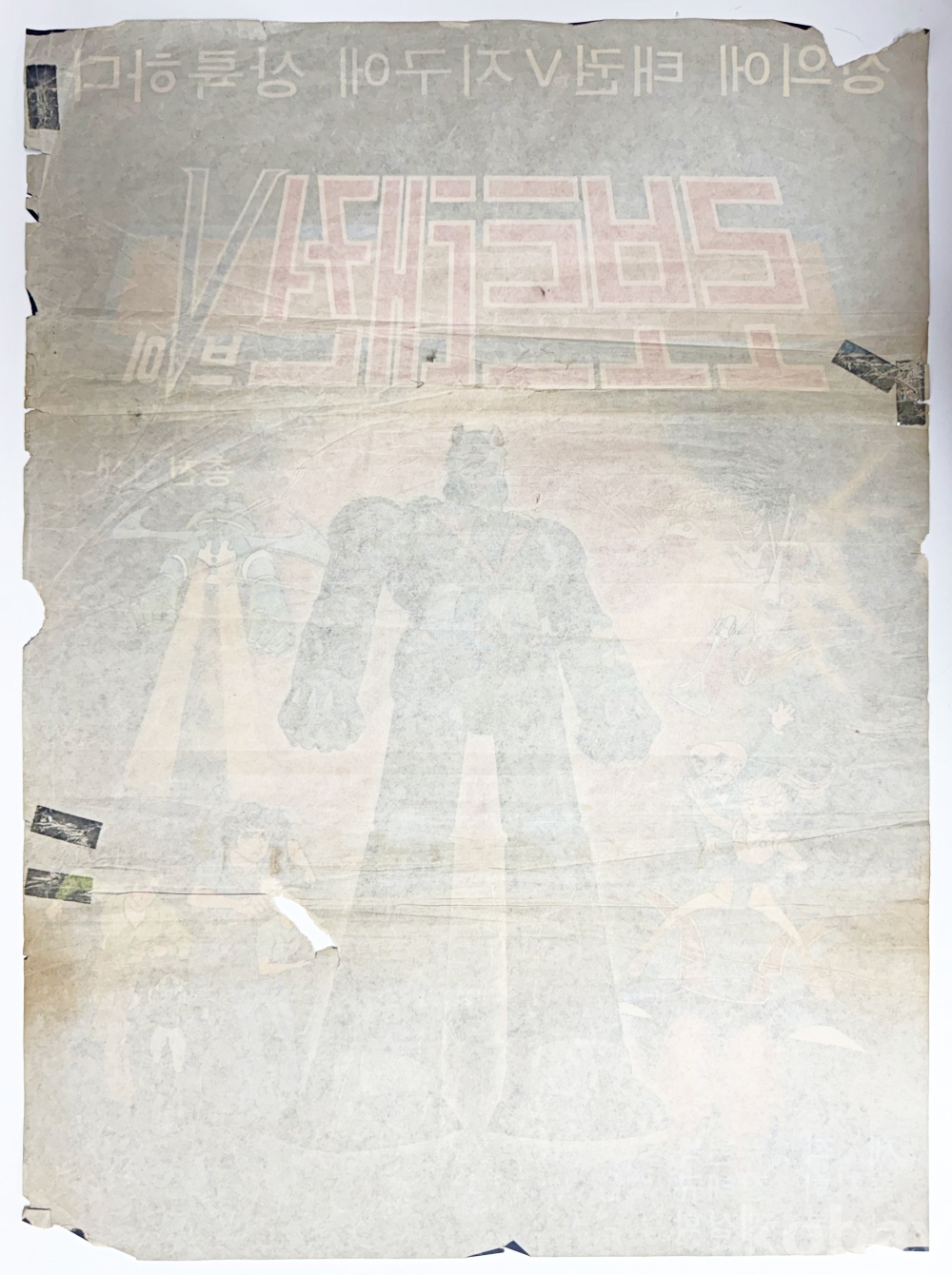 상품 설명 | 김청기 감독의 1976년 作 '로보트 태권브이'의 지방판 포스터이다. 상,하단 모서리 및 옆면 일부 유실, 하단 중앙부 구멍, 테이프 수리 다수 있음. | ||